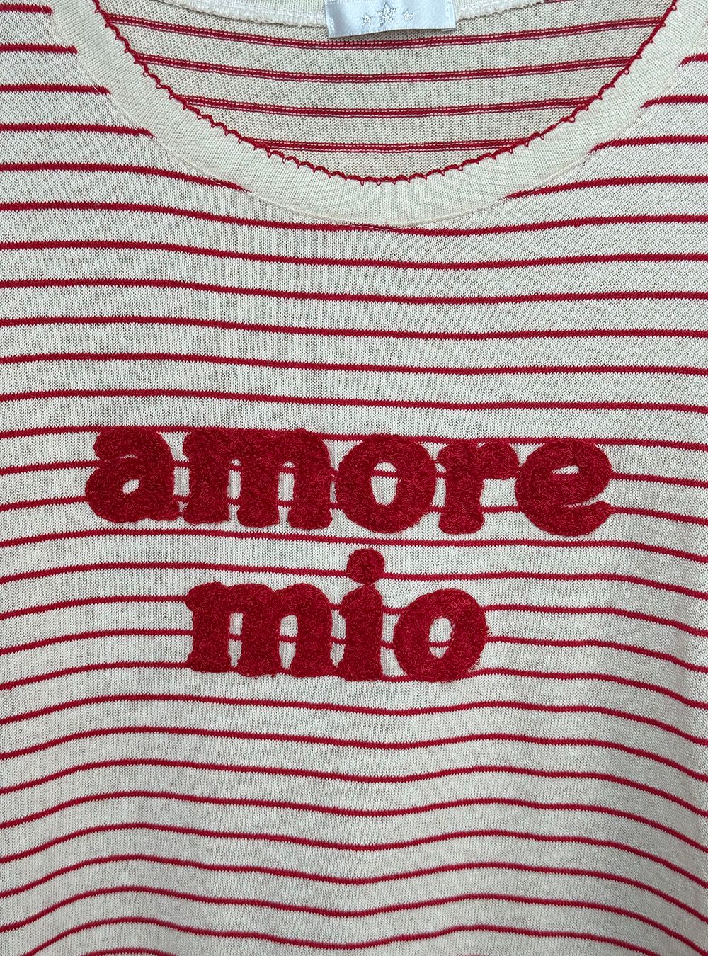 Camiseta de manga corta con vuelta y cuello redondo, confeccionada en punto fino. Estampada a rayas finas horizontales a contraste. Detalle en pecho de inscripción téxtil tipográfica en relieve con la expresión "amore mío".