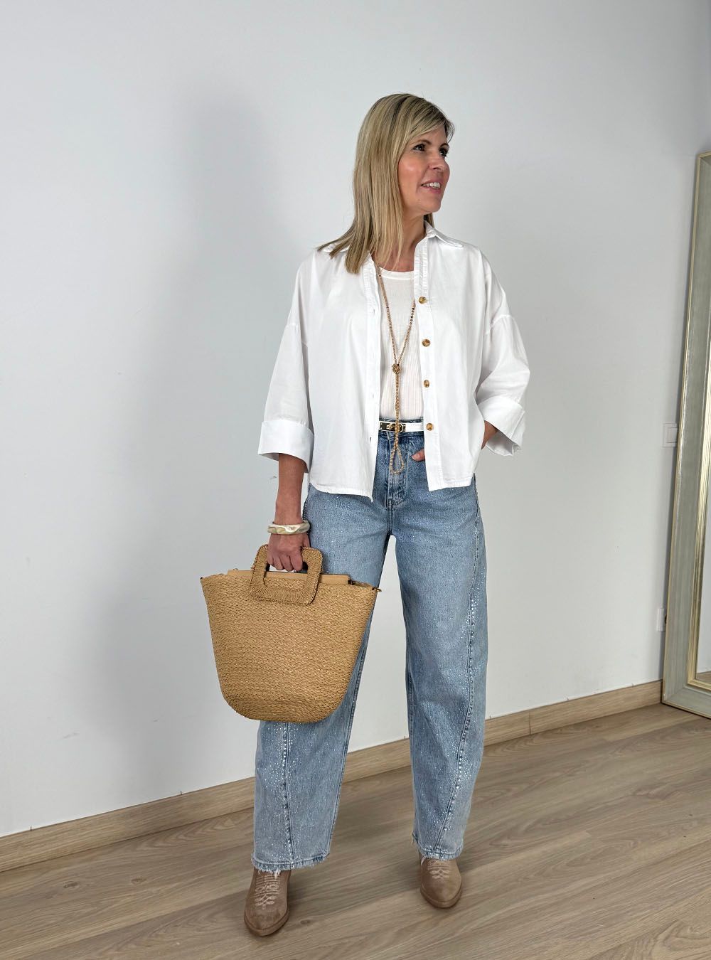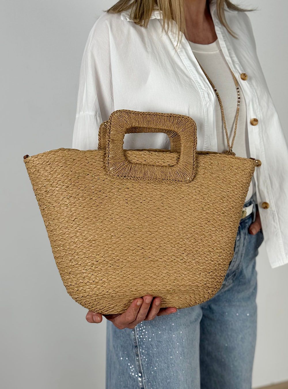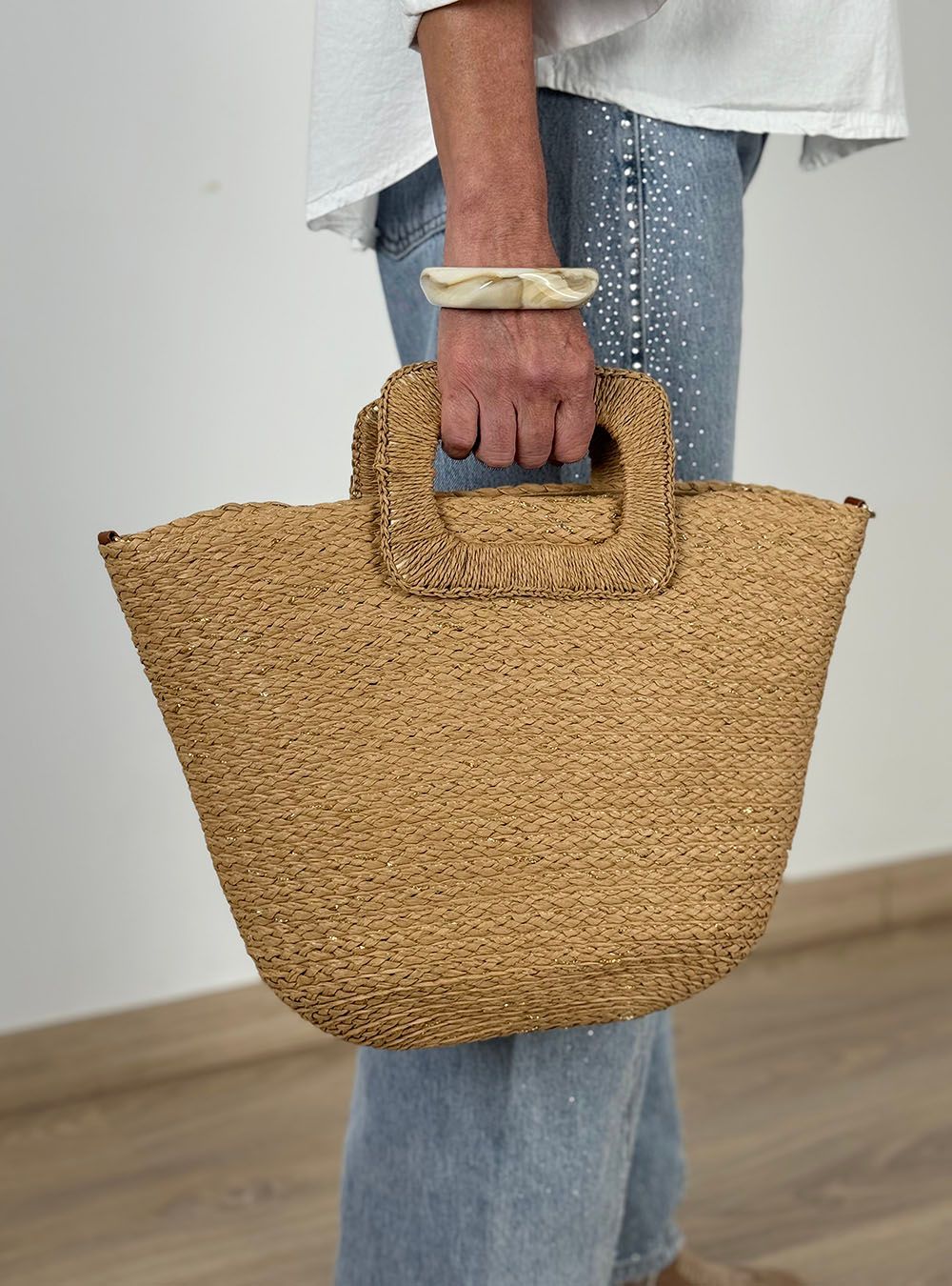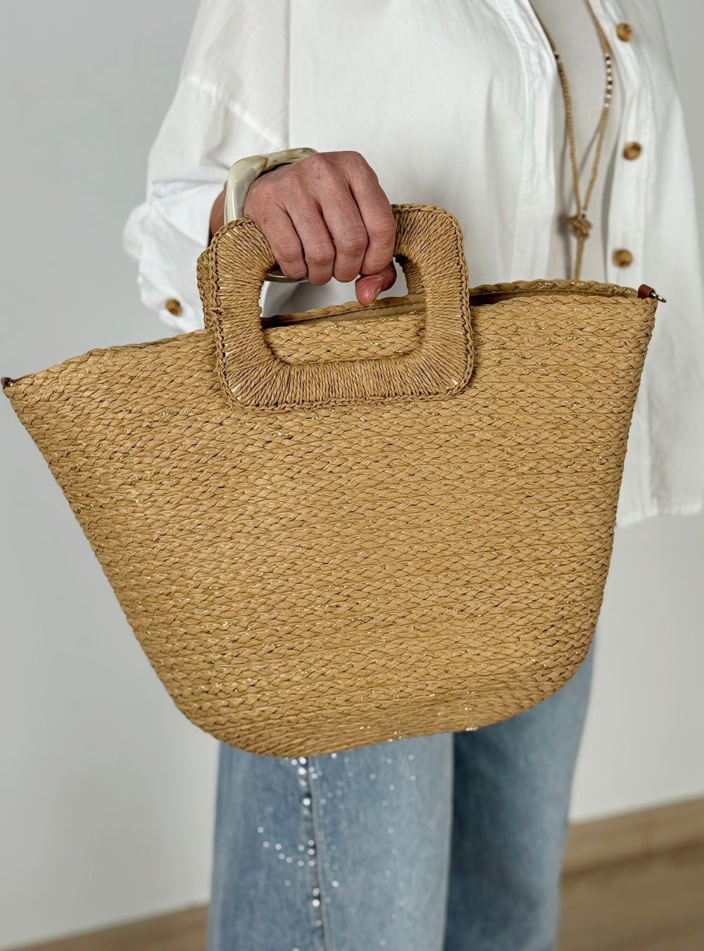 Capazo de rafia tejida con detalles de lurex dorado. Destaca por su asa rectangular rígida forrada con el mismo material. Cuenta con un único compartimento espacioso con cierre de cremallera y una correa de hombro de piel extraíble. Un accesorio cómodo y práctico para tus paseos de primavera-verano o para salidas informales.