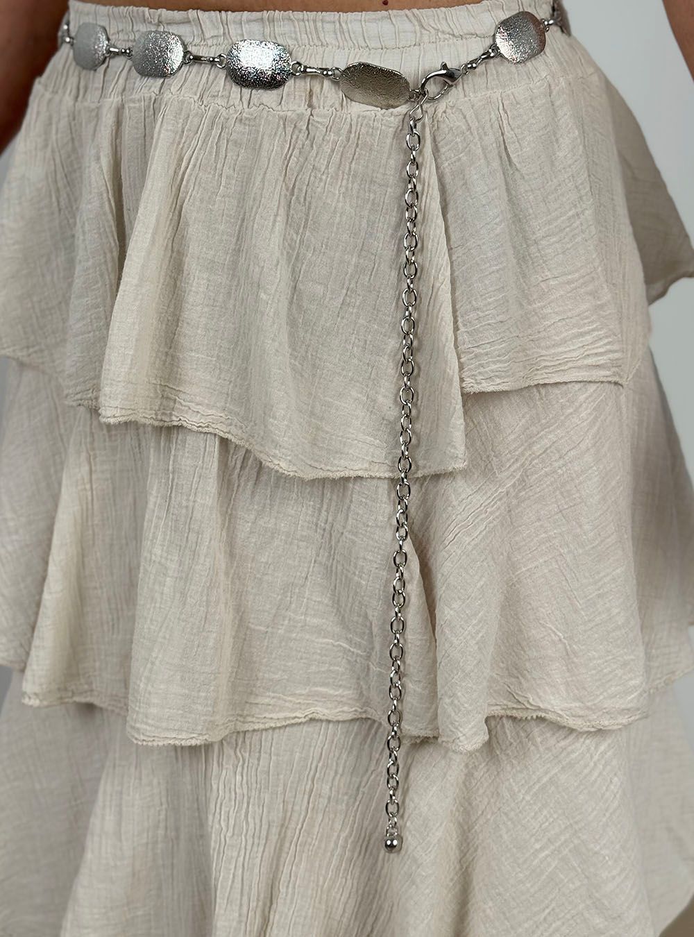 Cinturón de cadena metálico de inspiración bohemia. Se compone de cadena ajustable mediante cierre con mosquetón y piezas ovaladas con acabado texturado repartidas de manera equidistante por todo el perímetro.