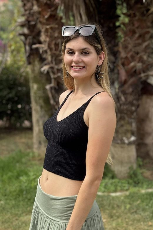 Crop top elástico con tirantes, confeccionado en punto lurex brillante. Escote delante en V y recto en la espalda.