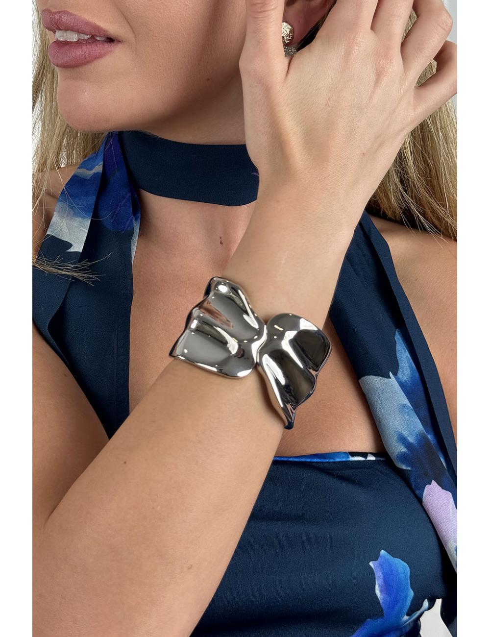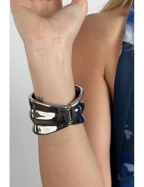 Wide textured metal bracelet with irregular wavy shapes in relief. Invisible hinge opening system. The ideal complement to your outfit for an event or graduation.