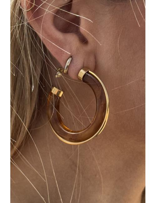 Earrings made up of the main piece in the shape of a semi-transparent hoop that allows the light to pass through, giving different shades and tones. Small round golden clasp. Made in polished methacrylate.