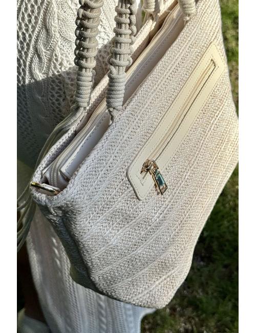 Medium raffia effect bag. It has two handles, zipped accessory pocket on the back and zip closure on the top.