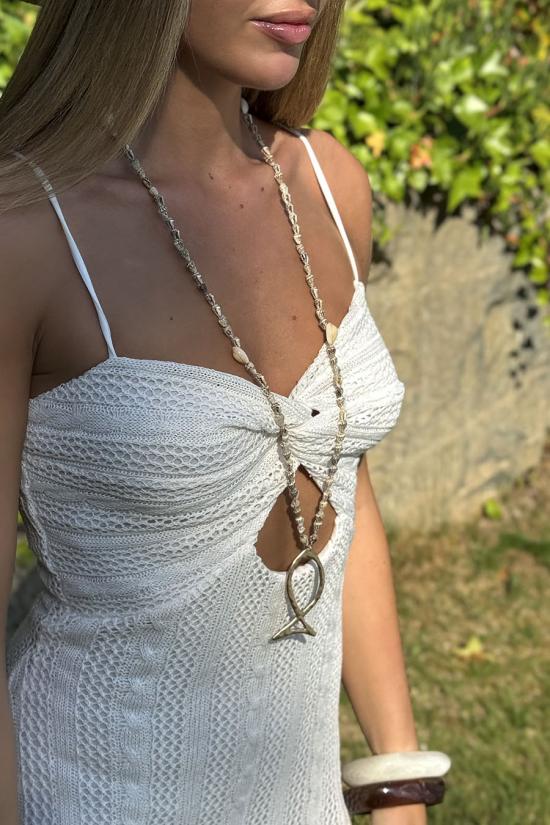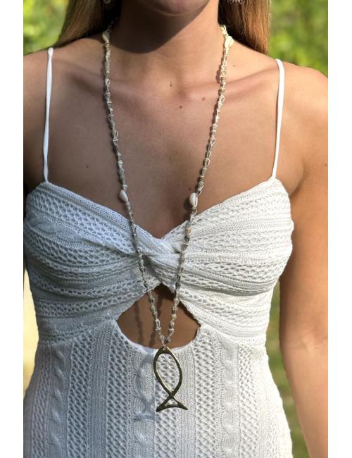 Bohemian style long necklace made of small pearly shells and fish with metallic finish.
