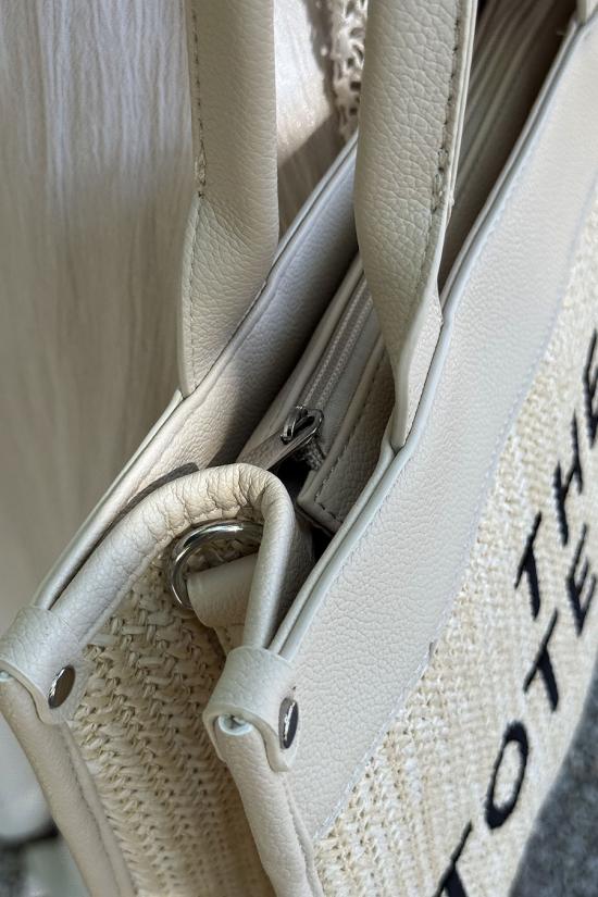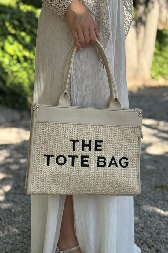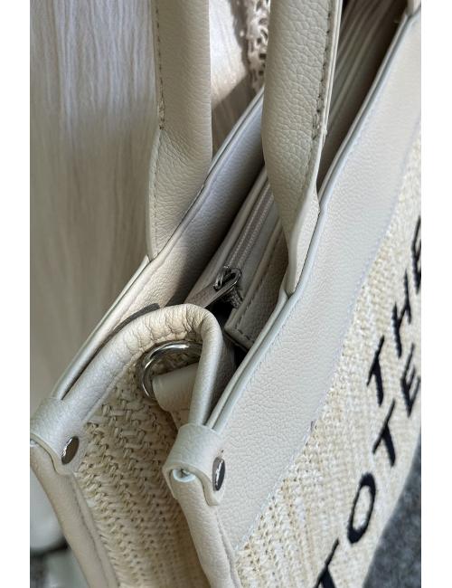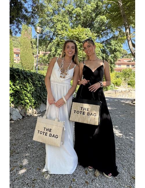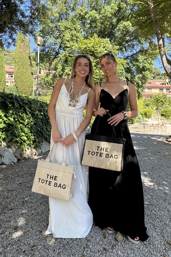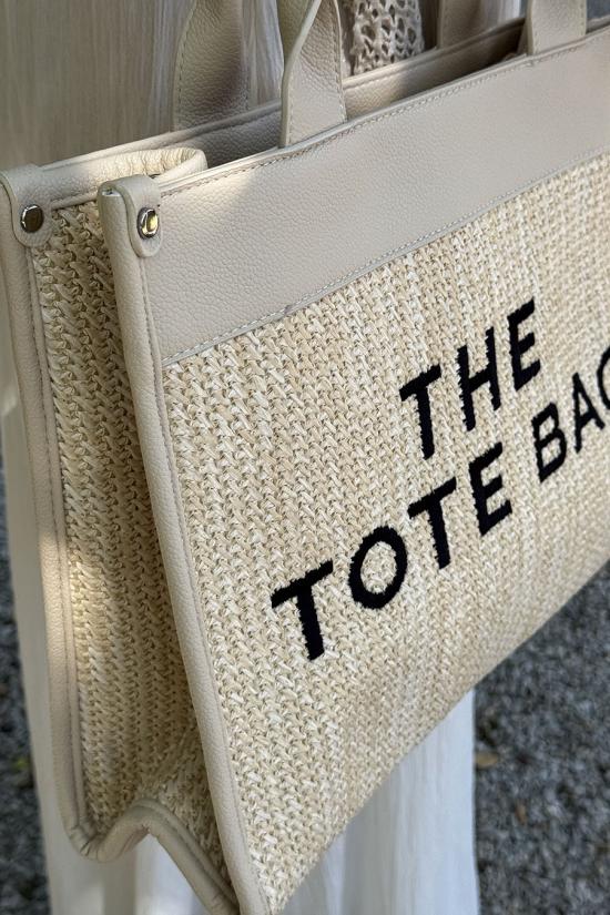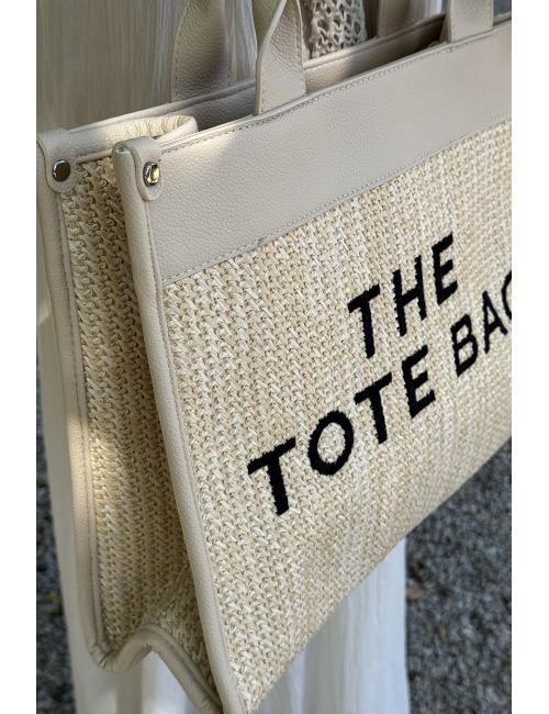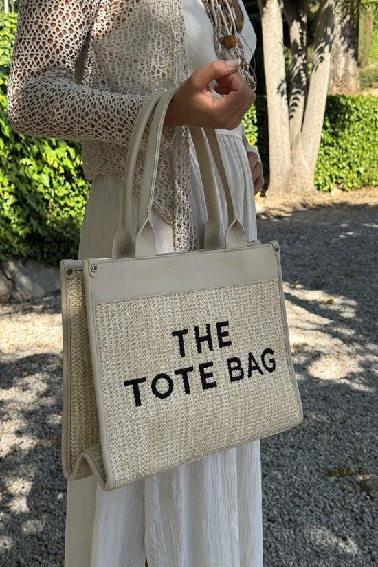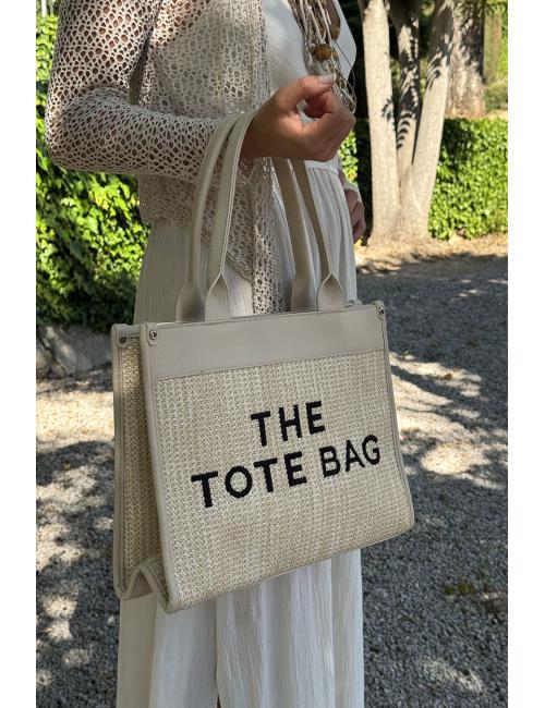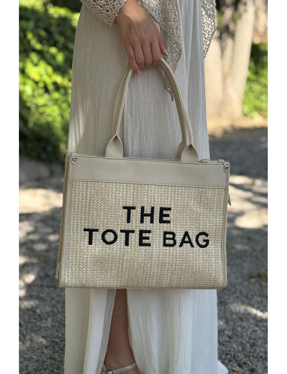 Medium bag made of textured raffia and eco-leather with the embossed inscription "The Tote Bag". Includes shoulder straps. Bohemian style, it is practical and compatible with all kinds of outfits. Central top zipper closure.