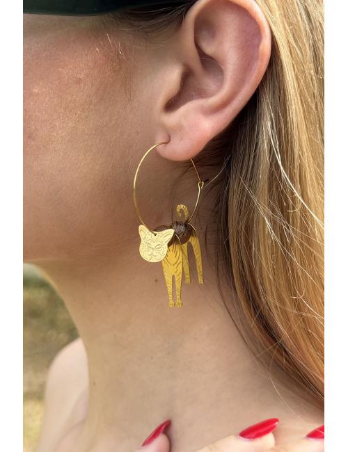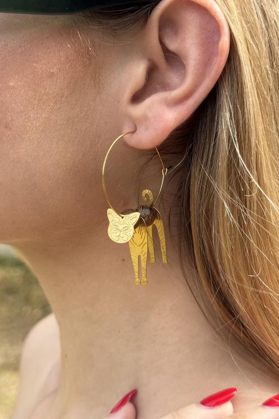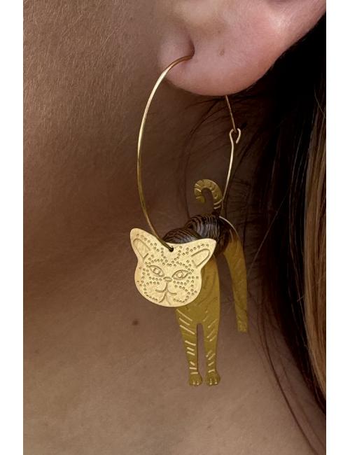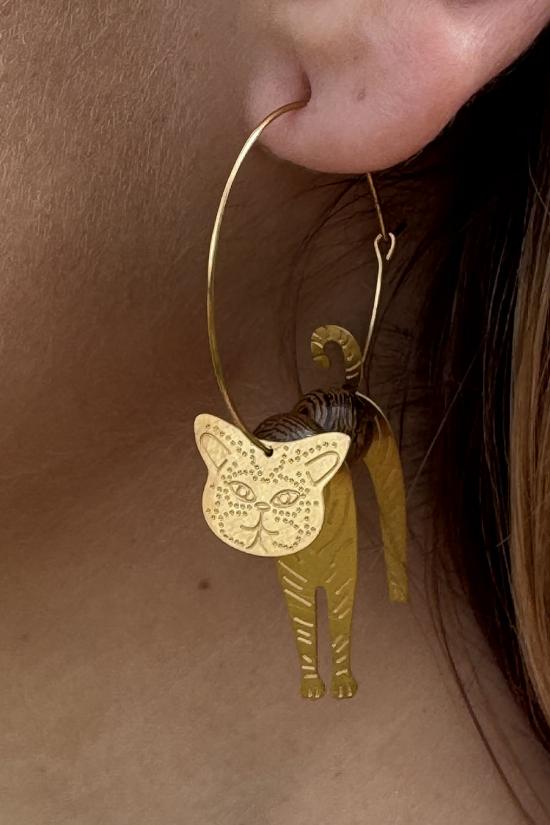 Fine gold plated hoop earrings with gold plated cat detail with chocolate brown beads.