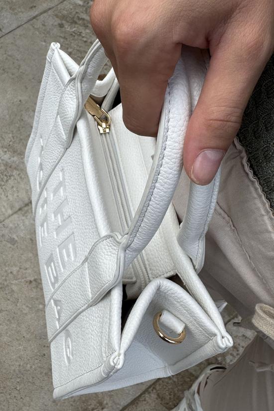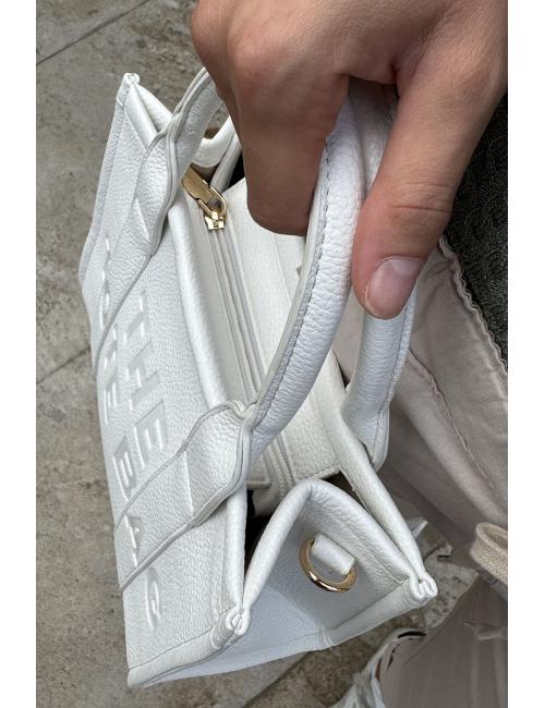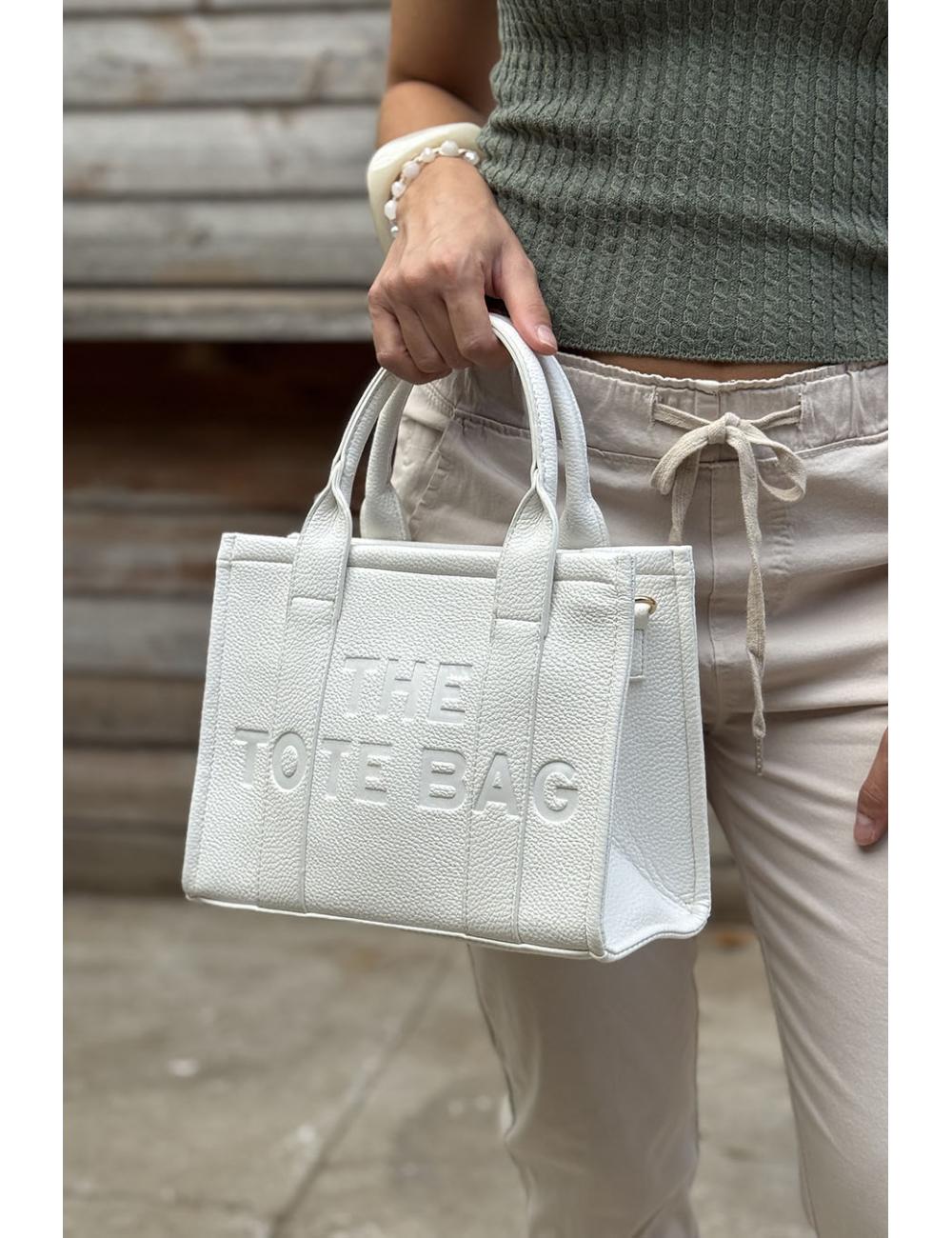 Small bag made of textured faux leather with the embossed inscription “The Tote Bag.” Includes shoulder and hand straps, urban style, practical, and compatible with all types of outfits. Central top zipper closure.