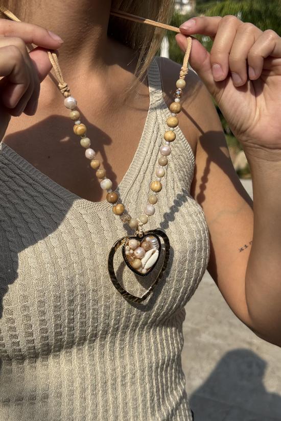 Long necklace made up of a thin string in ochre tones adorned with pearl and wooden beads. Double heart, one large gold heart and another smaller heart lined with various beads with marine motifs.