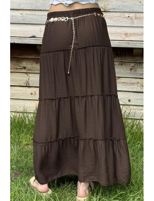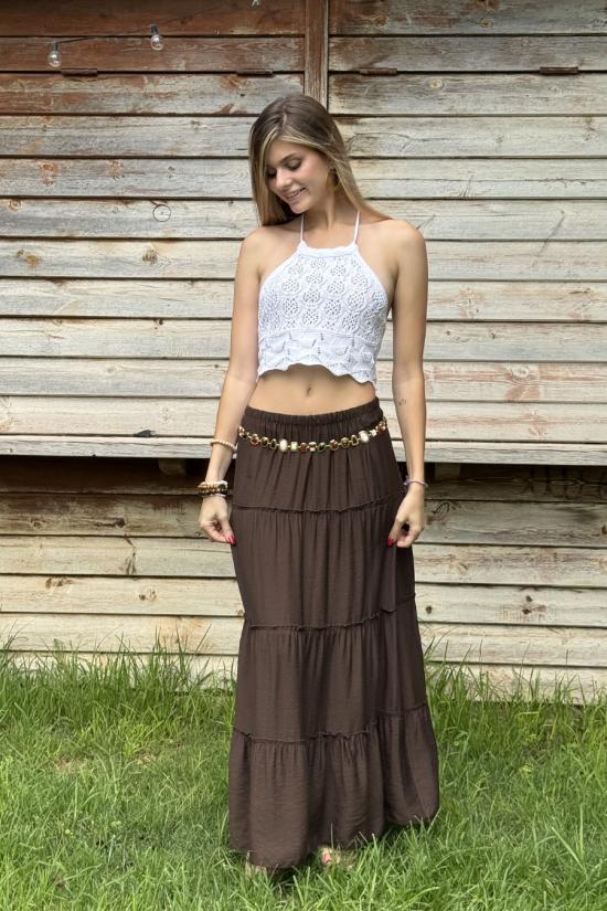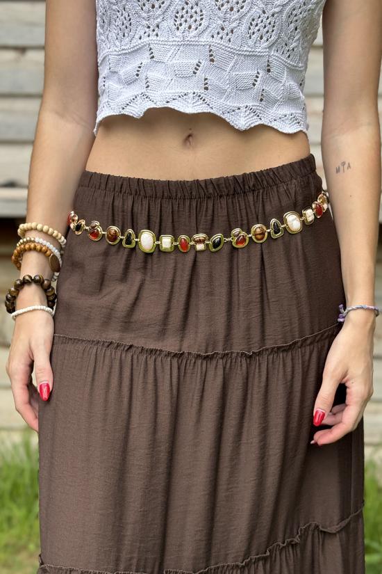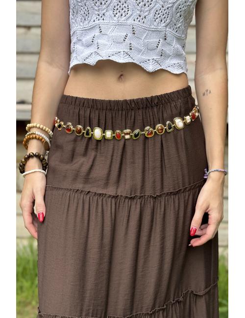 Gold chain belt with stones and beads of various sizes and finishes. The chain has a small gold ball at the end. Ideal for complementing your skirt, trousers or shorts.