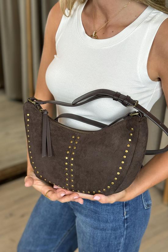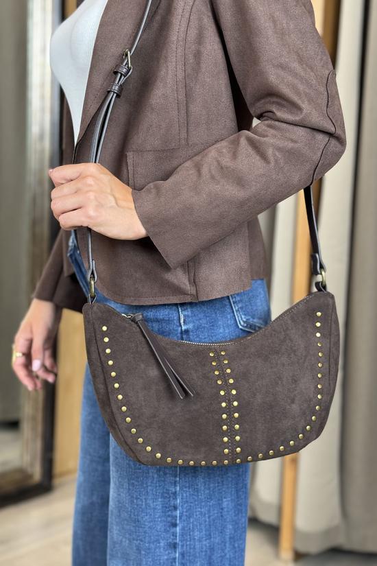 Shoulder bag made of suede with leather cord detail on the main zipper, gold studs on the front, and smooth on the back. Gold metal zippers and adjustable shoulder strap.