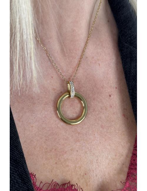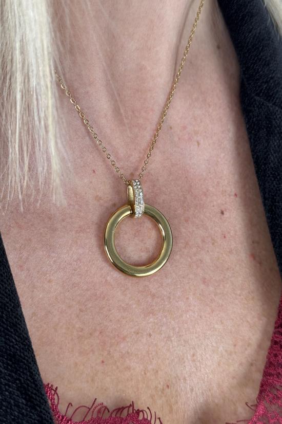 Short golden steel necklace. Composed of a thin chain and a thick ring with rounded shapes.