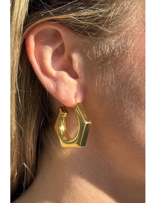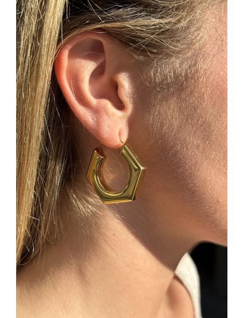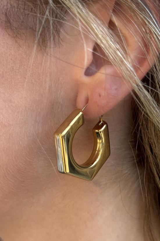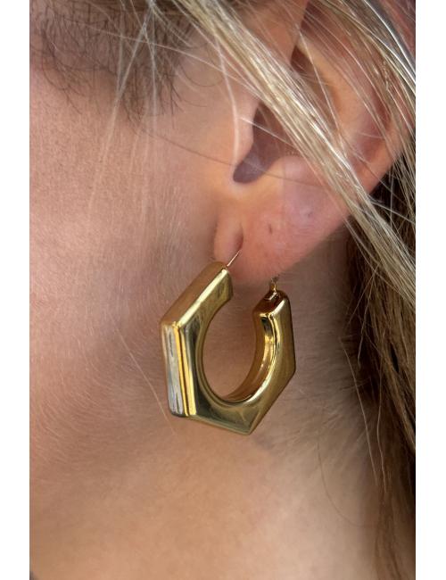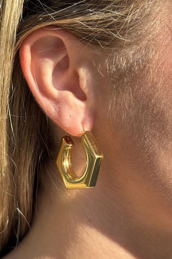 Earrings in the shape of an incomplete hexagon. Thick metallic structure.