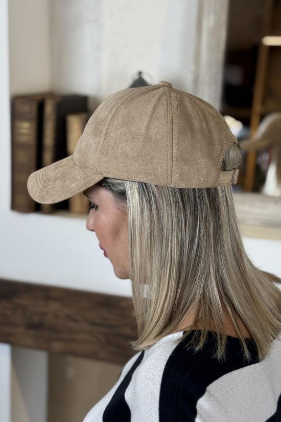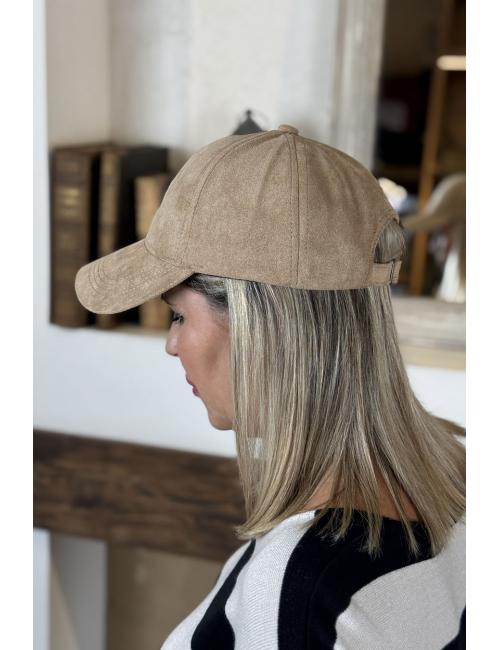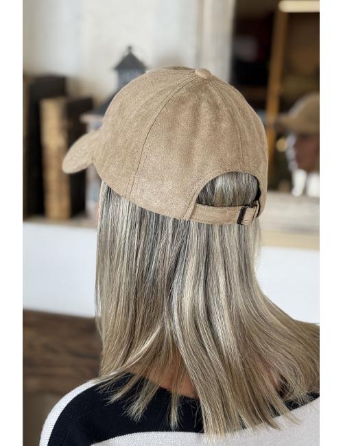 Cap made from suede fabric with a split leather finish. Adjustable at the back with a metal buckle.