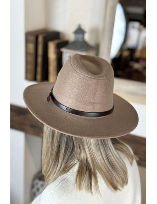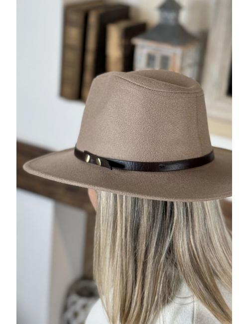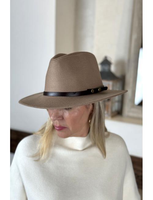 Fedora-style hat with a wide brim and indented crown with a longitudinal crease. Made from felt. Faux leather ribbon detail with metal rivets around the crown. This hat will add a distinguished, casual traveller touch to your outfit.