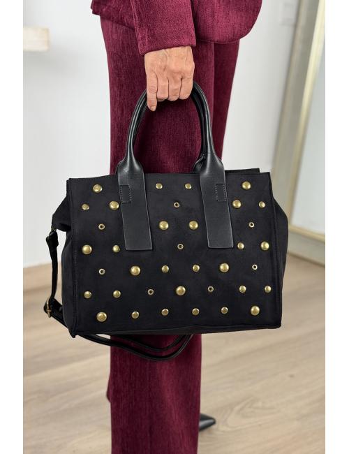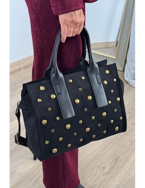 Medium-sized suede-effect bag. Gold stud and rivet detailing in various sizes. Double fixed handle for carrying by hand or long handle for carrying over the shoulder. Central top zip closure. Zipped compartment on the back. The ideal accessory if you want to combine contemporary style with everyday practicality.