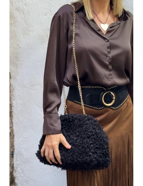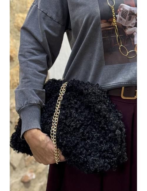 Black sheepskin handbag with magnetic closure and lilac lining. It has a long removable gold chain strap so it can be worn over the shoulder or across the body.
