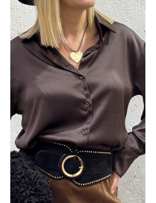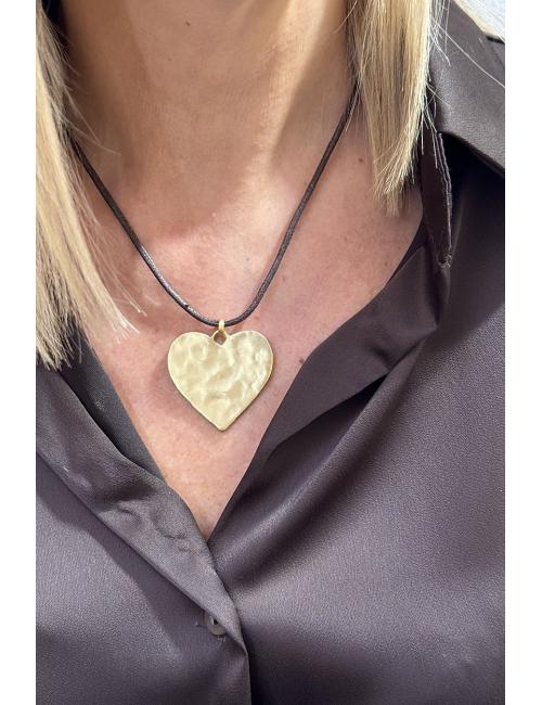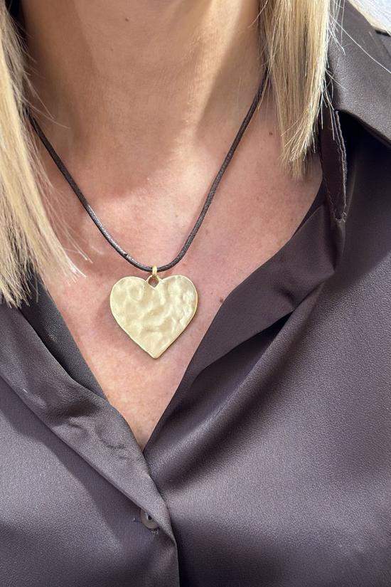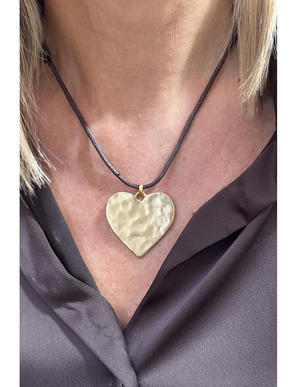 Necklace consisting of an adjustable brown cord and a gold metal heart with a wavy texture.
