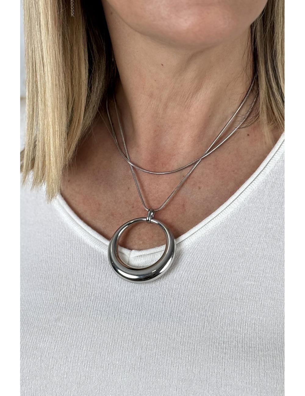 Long silver-plated steel necklace. Fine metal chain with large ring. You can wear it in two ways, either at its full length or doubled up. Add a touch of distinction to your urban or weekend outfits with this sophisticated and timeless necklace.