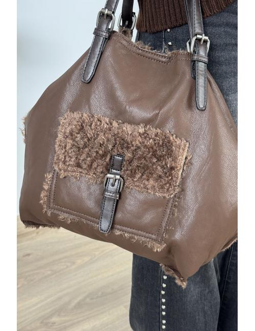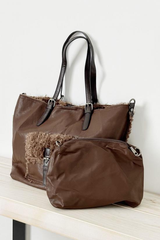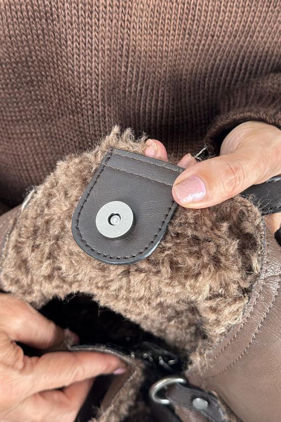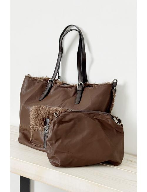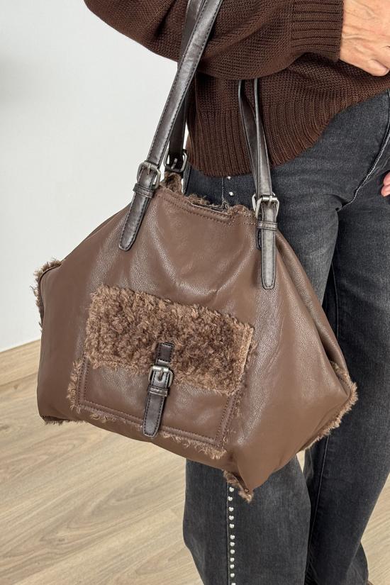 Medium-sized bag made of faux leather with flap details, piping and sheepskin lining. Belt-style faux leather handles with buckle. A unique, practical and stylish bag for your comfy sport chic outfits.