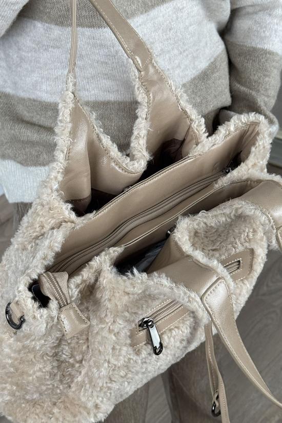 Shopper bag made from sheepskin with faux leather handles. Includes shoulder straps. Top closure with zip and magnetic button. A unique, practical and stylish bag for your comfy sport chic outfits.