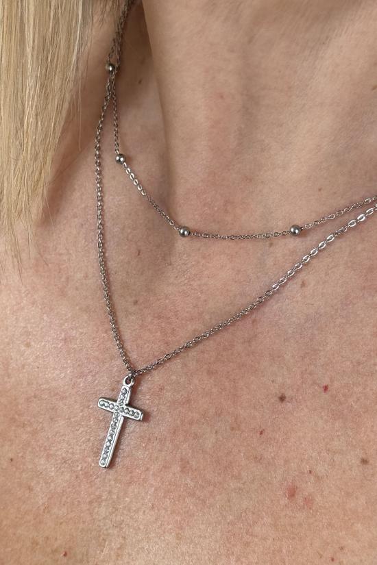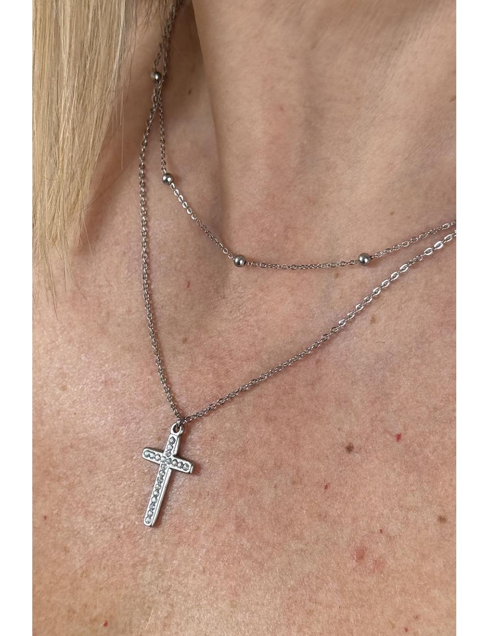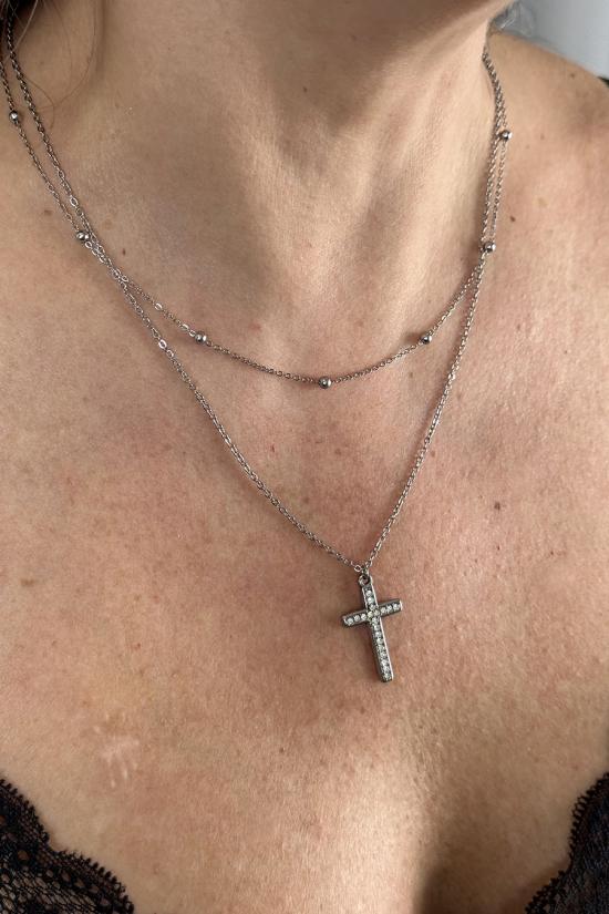 Double choker composed of a fine silver chain with small ball inserts and a cross detail with diamond inserts.