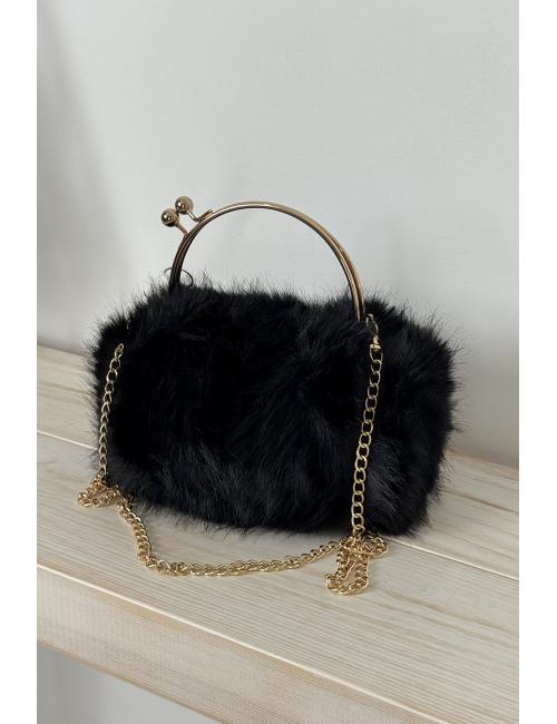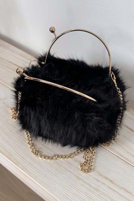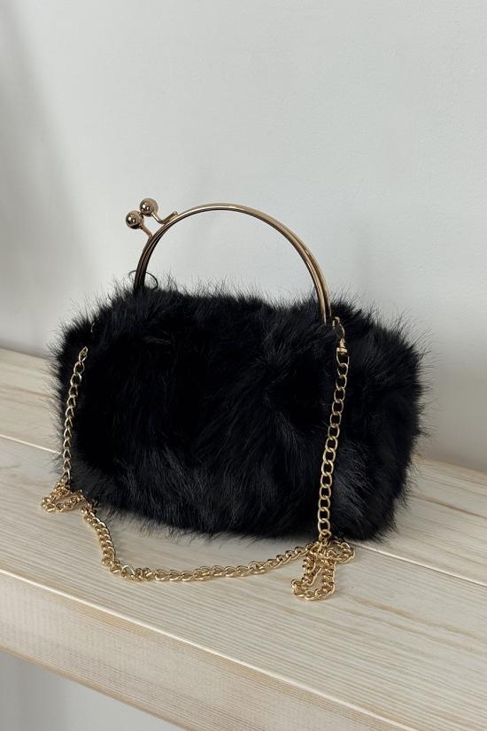 Shoulder bag made from extra-soft synthetic fur. Fastens with curved metal handles. Includes metal chain for carrying over the shoulder.