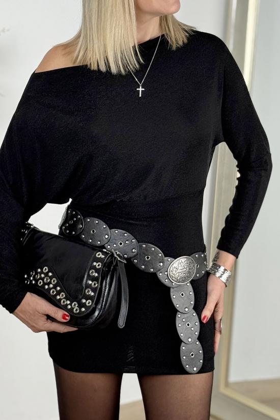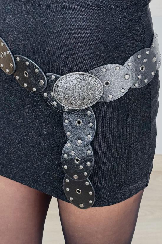 Wide belt made of faux leather with round, openwork metal studs. Large oval silver buckle with an engraved surface. Add a touch of casual sophistication to your outfits. The perfect accessory to elevate your looks with jeans, skirts, and dresses.