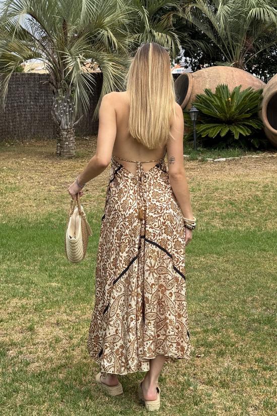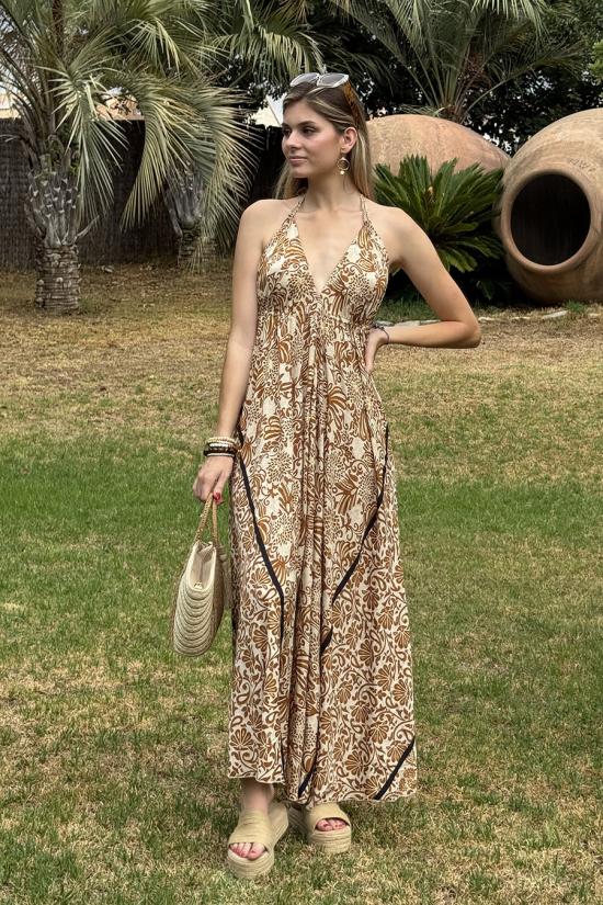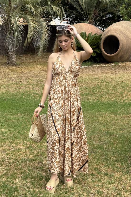 Long boho style dress, with V-shaped front neckline. Printed with floral motifs. Tied at the neck and back and you can adjust it at the waist. The neckline is plunging at the back. This dress is made of a particularly soft and cool silky fabric. It has a beautiful drape, feels great and is ideal for the summer season.