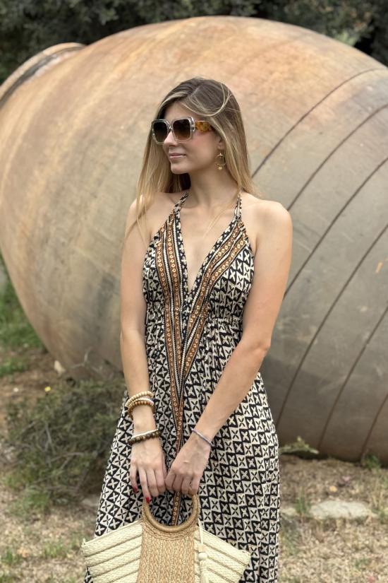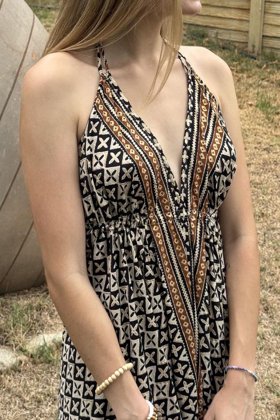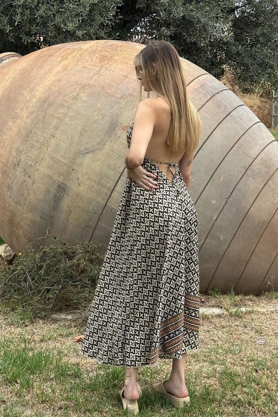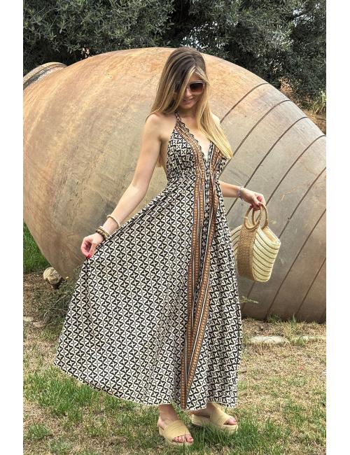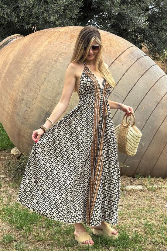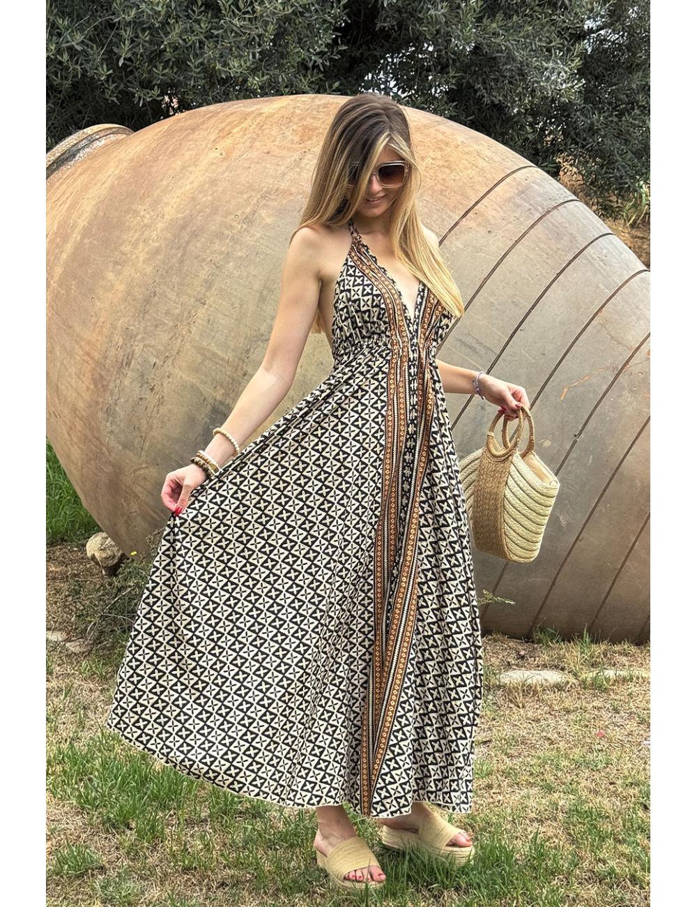 Long boho style dress, with V-shaped front neckline. Printed with geometric motifs. Tied at the neck and back and you can adjust it at the waist. The neckline is plunging at the back. This dress is made of a particularly soft and cool silky fabric. It has a beautiful drape, feels great and is ideal for the summer season.