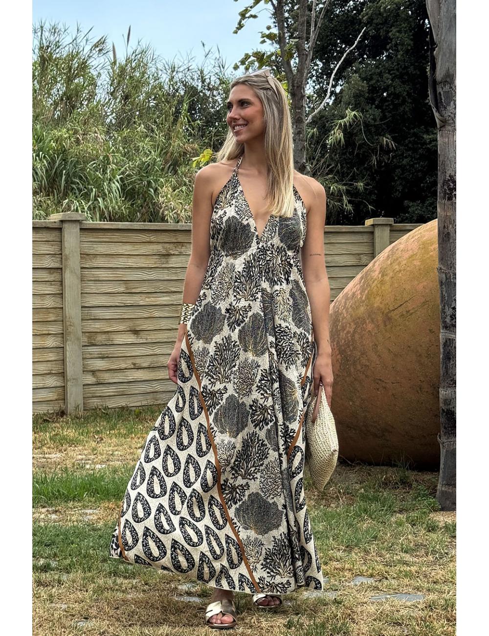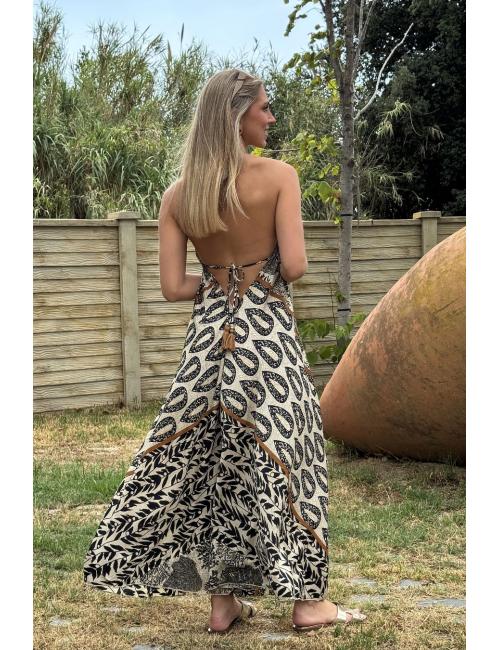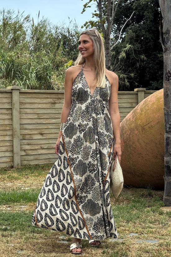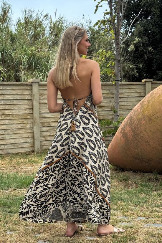 Long boho style dress, with V-shaped front neckline. Printed with floral motifs. Tied at the neck and back and you can adjust it at the waist. The neckline is plunging at the back. This dress is made of a particularly soft and cool silky fabric. It has a beautiful drape, feels great and is ideal for the summer season.