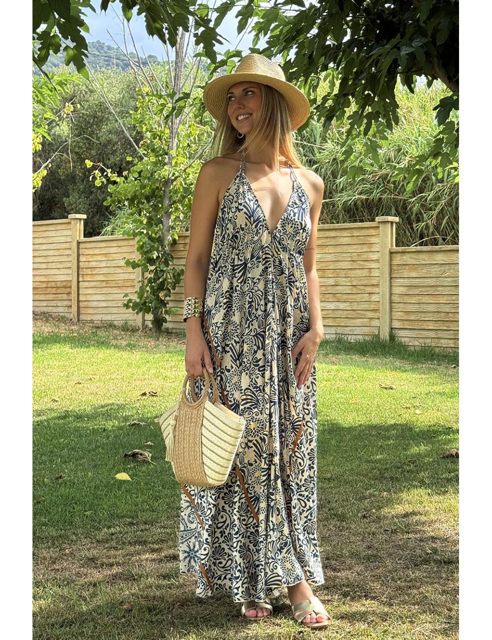 Long boho style dress, with V-shaped front neckline. Printed with floral motifs. Tied at the neck and back and you can adjust it at the waist. The neckline is plunging at the back. This dress is made of a particularly soft and cool silky fabric. It has a beautiful drape, feels great and is ideal for the summer season.