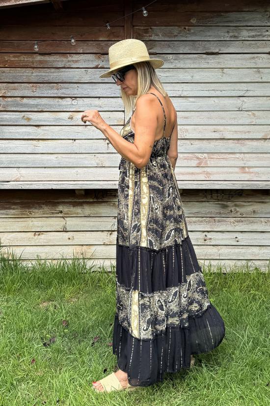 Long boho dress with a V-neckline at the front. Printed with bohemian motifs. Two thin straps that can be adjusted in height. You can cinch it at the waist with two pom-pom straps. The neckline is straight at the back. This dress is made from a silky fabric that is particularly soft and cool. It also has a beautiful drape and a flattering flare, making it ideal for any of your summer activities.