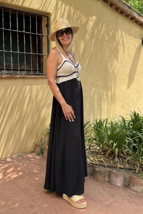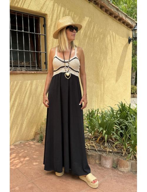 Long dress combi smooth flowing and crochet on the chest. Made with crepe fabric in the plain part and crochet upwards. Includes two thin straps.
