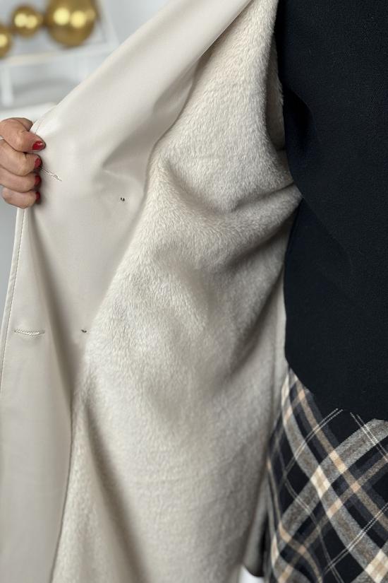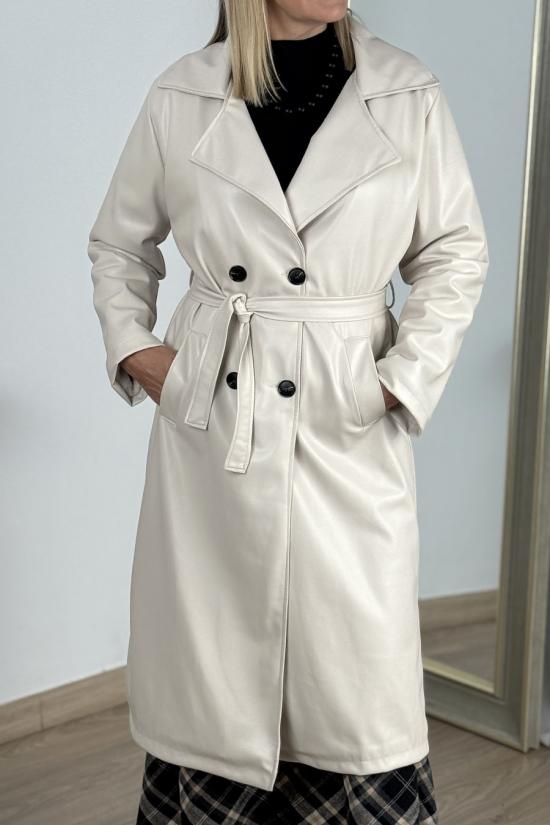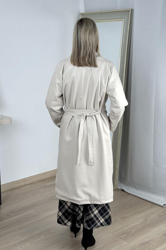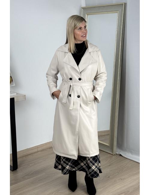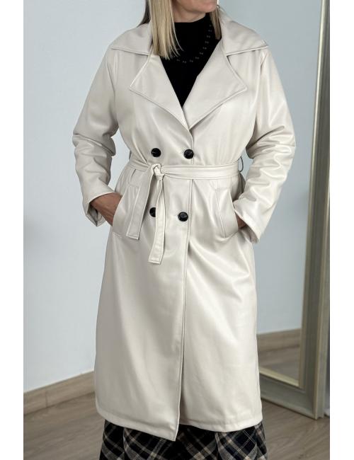 Long coat made from faux leather with sheepskin lining. Large lapel, closure with two buttons plus two decorative buttons. Belt in the same material for a better fit. Two side pockets.