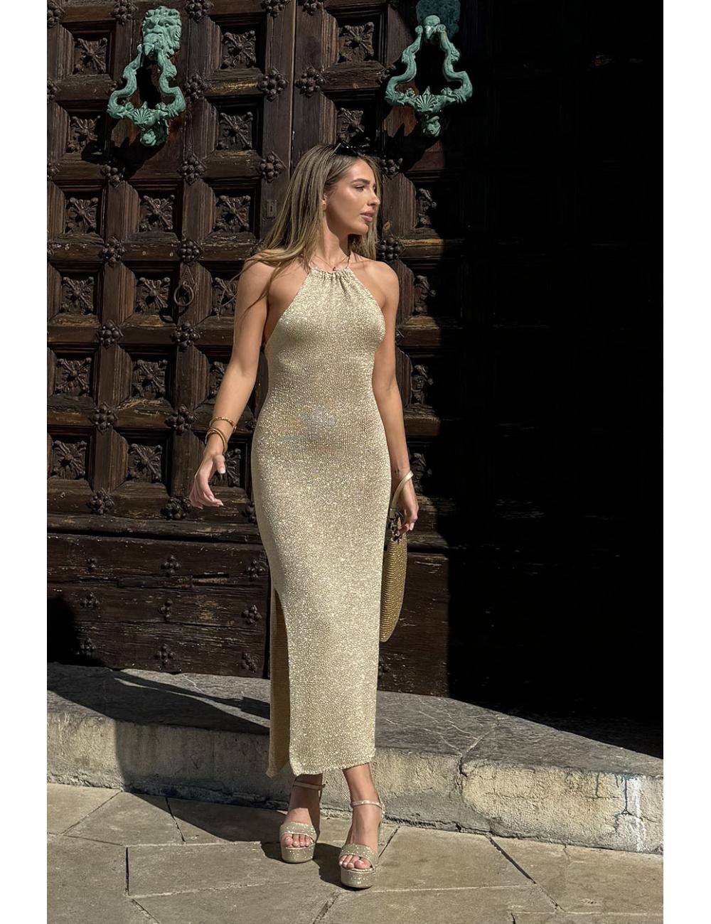 Midi dress made in shiny lurex knit. It has a halter neckline finished with two crossed straps tied at the back. It has two side slits at the bottom.