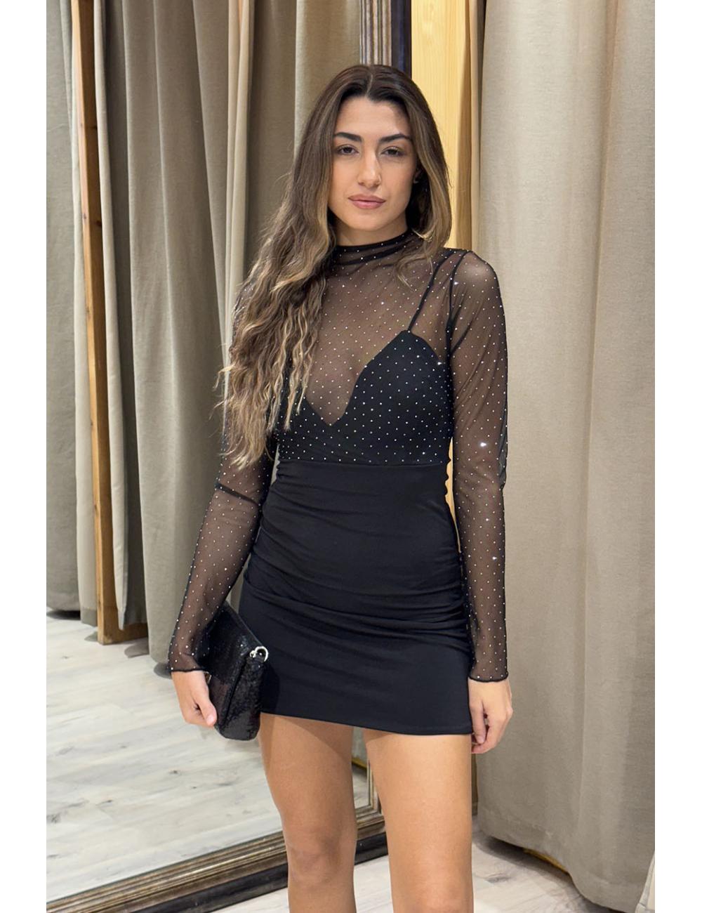 Mini dress combined with tulle and rhinestones on the top and smooth fabric on the skirt and chest. It has long sleeves and the tulle shirt overlaps the dress.