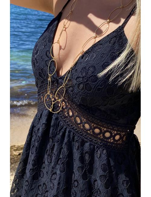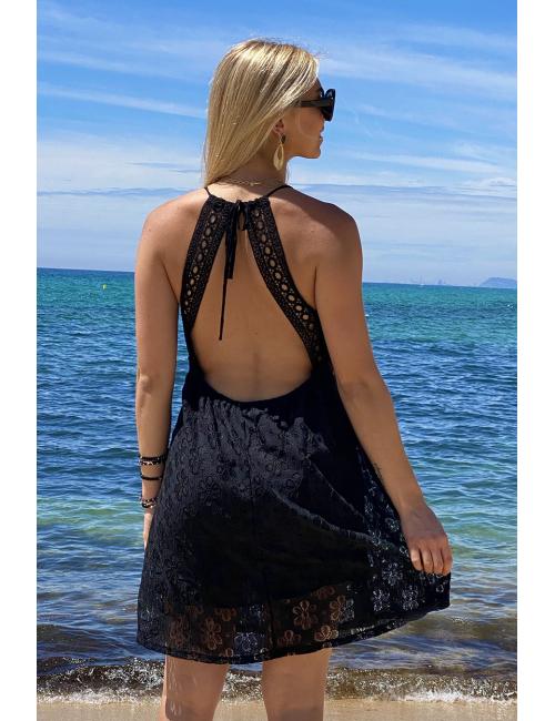 Short dress in openwork cotton with cups and guipure trimming under the bust. Back neckline.