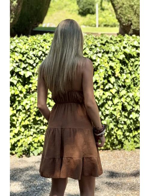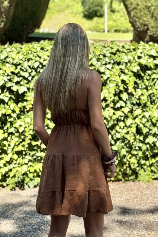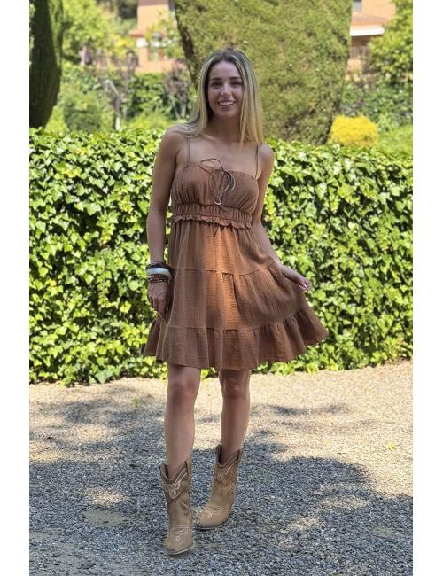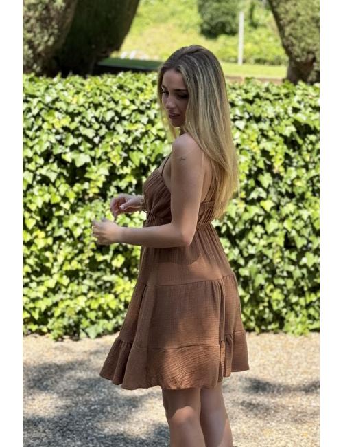 Short dress made of fine textured fabric. Ribbed elastic at the waist for a better fit. Chest neckline with V-neck opening adjustable with a bow.