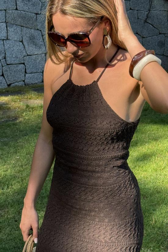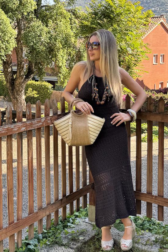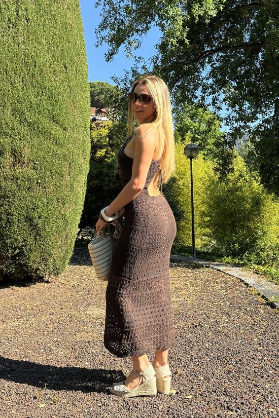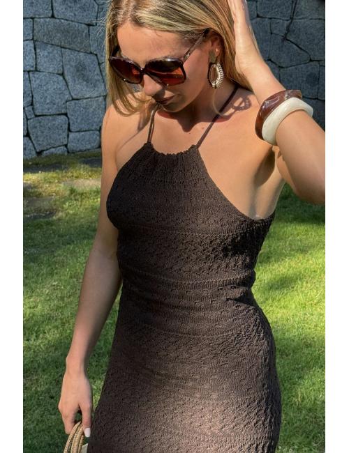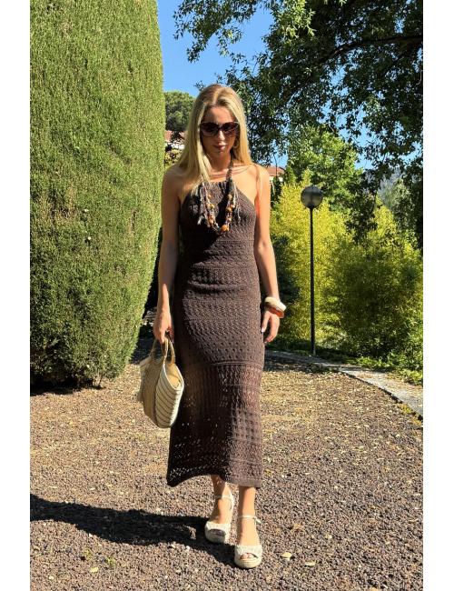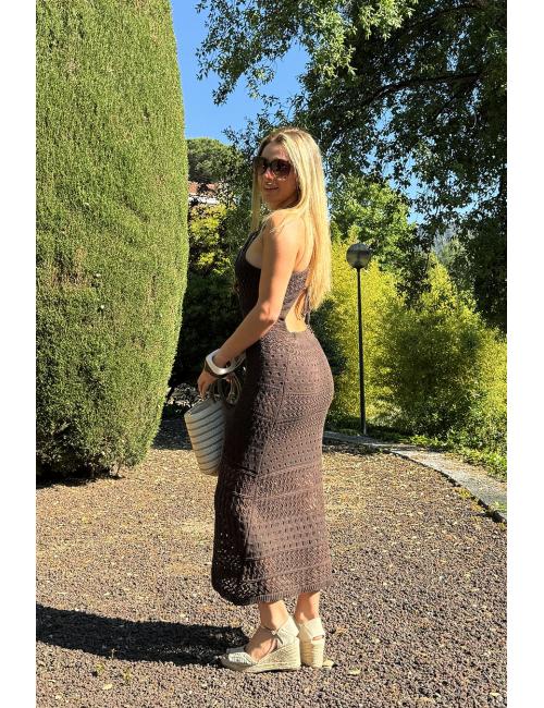 Tight midi dress made of elastic crochet. Sleeveless, it is tied at the back with two thin crossed straps. Includes anti-transparency lining.