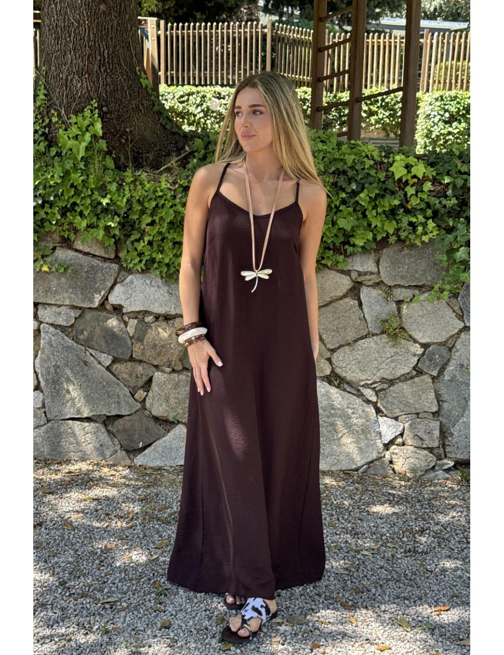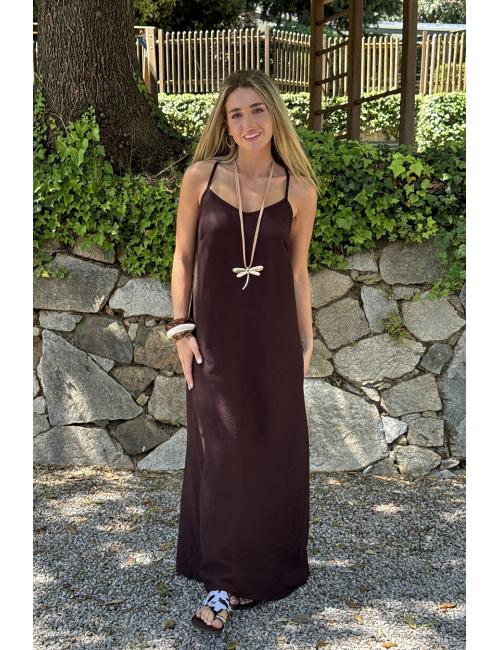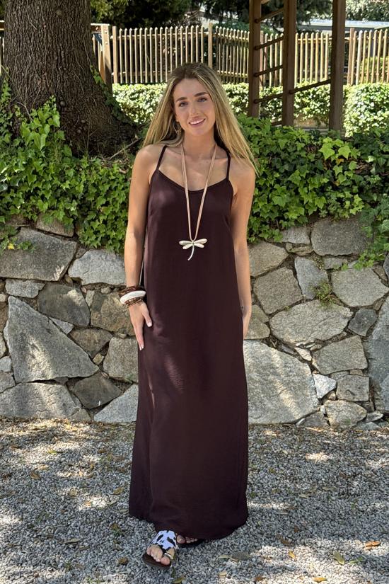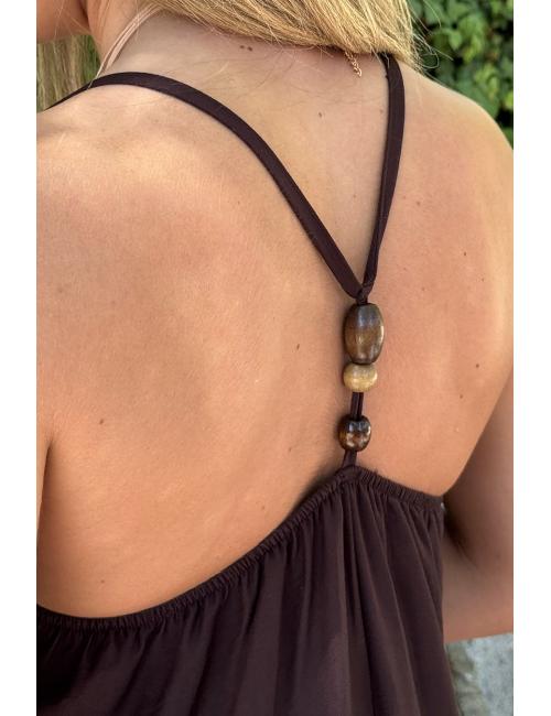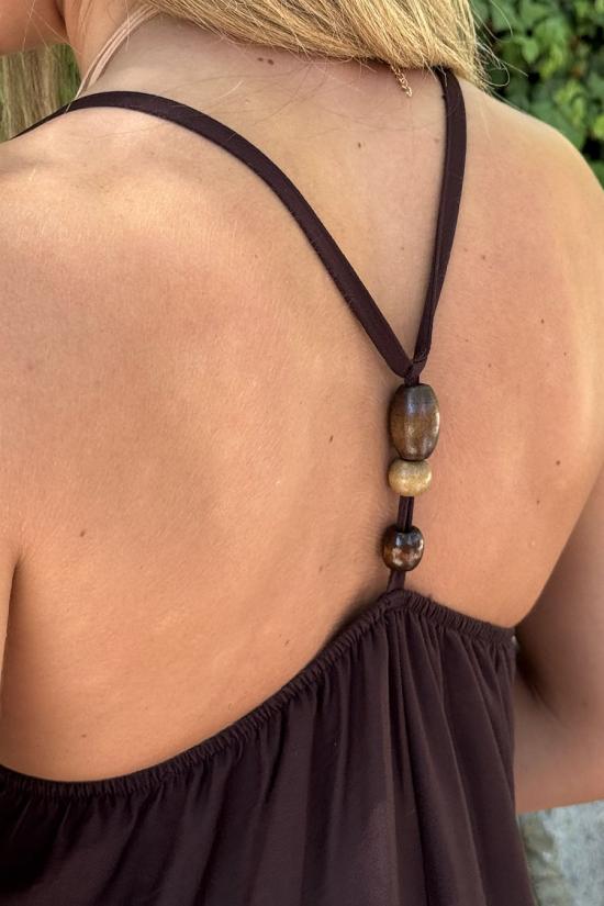 Long flowing dress made in bámbula. Thin straps and joined in the back by three small wooden beads. Rubber in the back that makes it adaptable to various sizes.