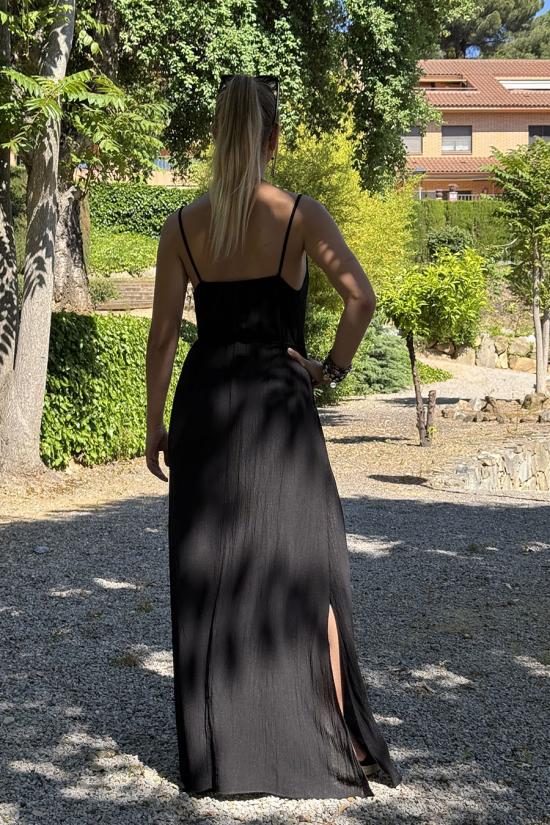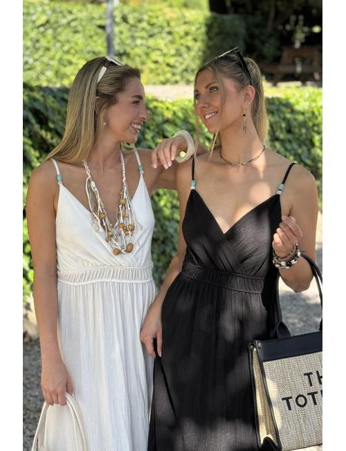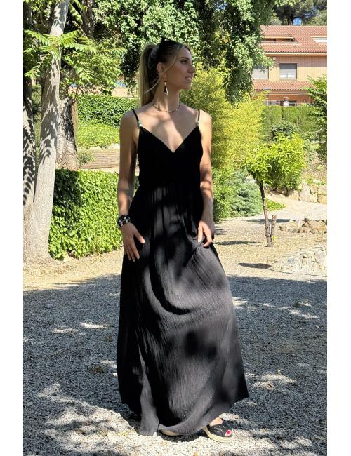 Long flowing dress made in bámbula. Thin straps with detail in front of two small turquoise and white beads. Elastic at the waist that makes it adaptable to several sizes.