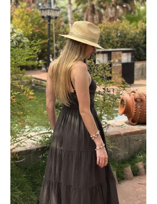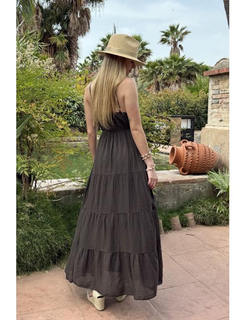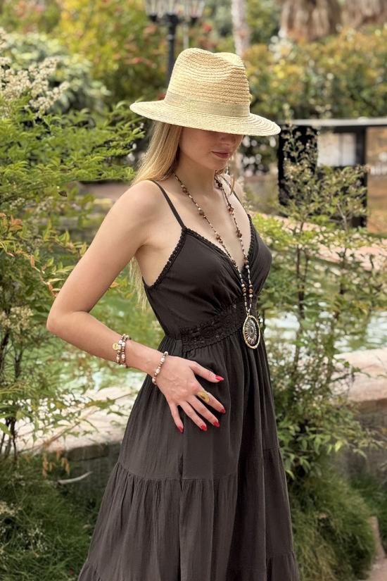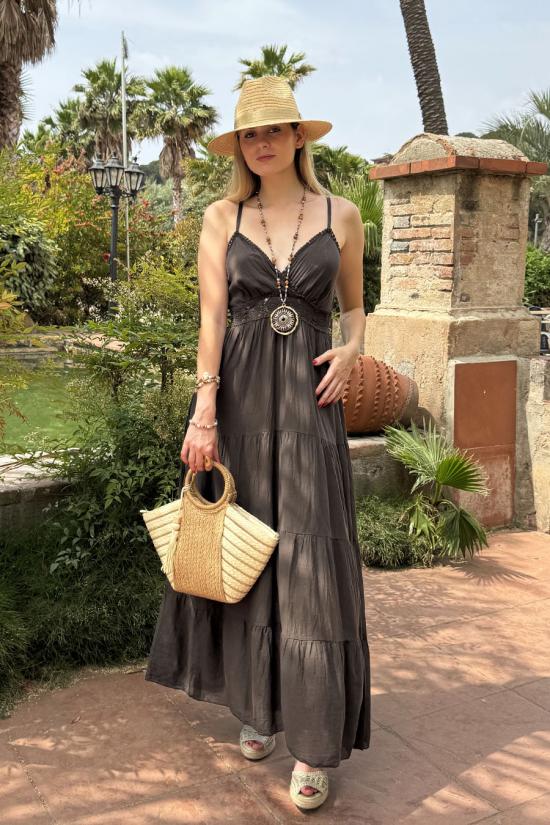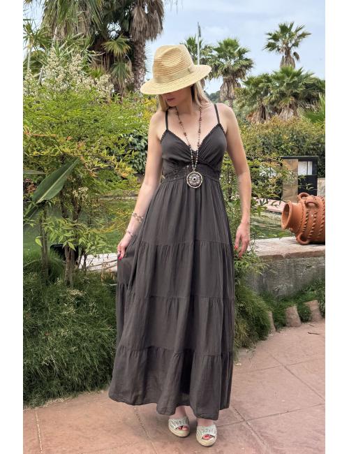 Long dress with ruffles made of cotton with embroidered guipure detail below the chest. V-neckline and thin straps adjustable in height. Anti-transparency inner lining.