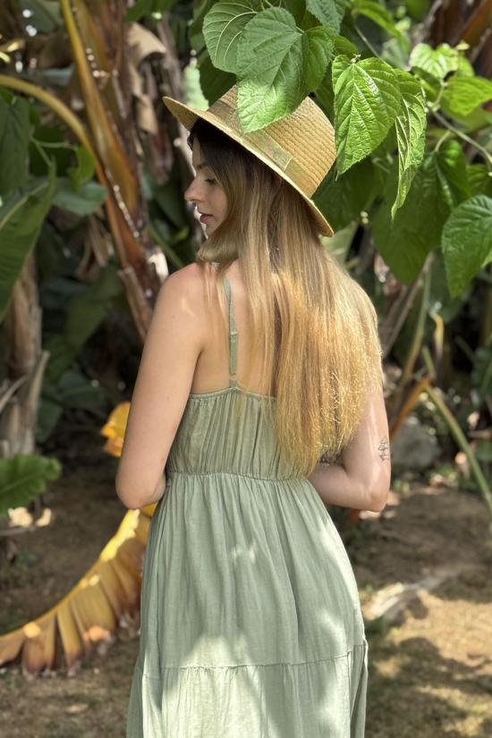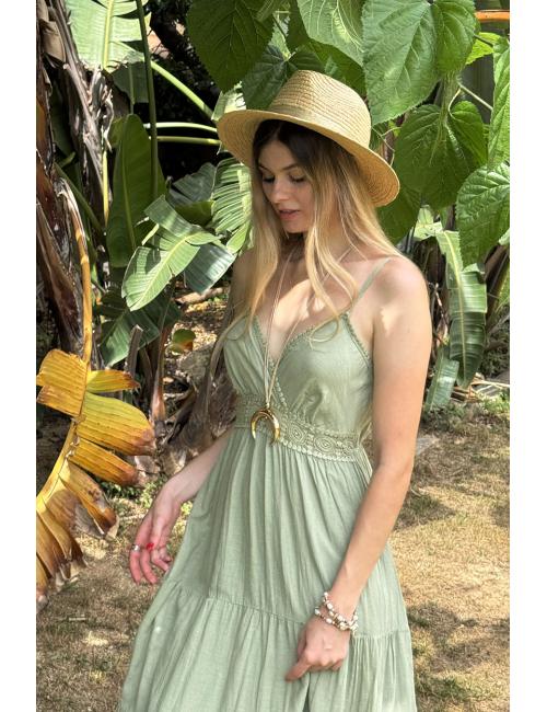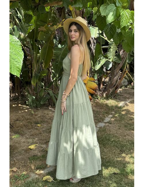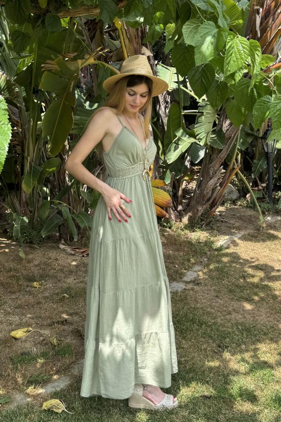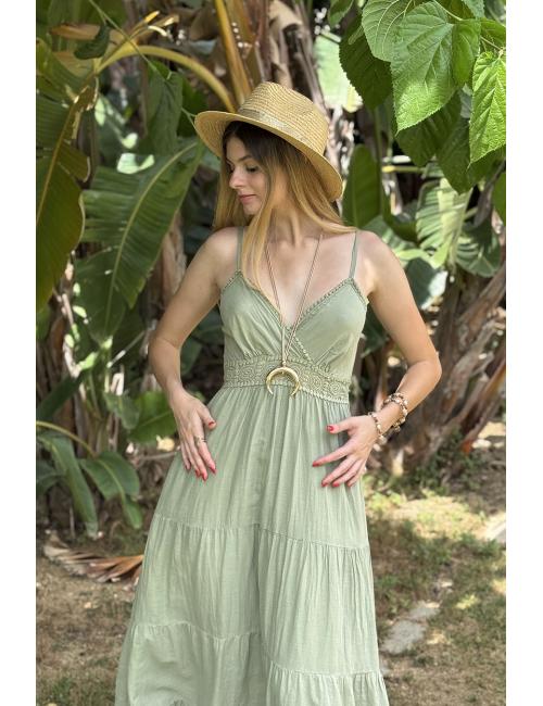 Long dress with ruffles made of cotton with embroidered guipure detail below the chest. V-neckline and thin straps adjustable in height. Anti-transparency inner lining.