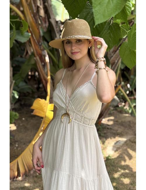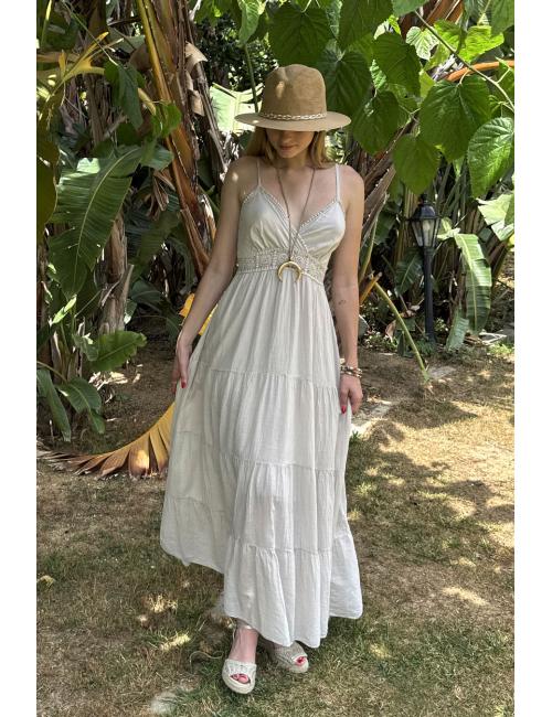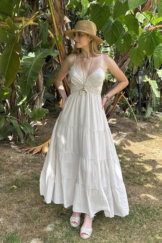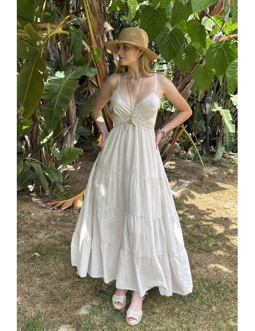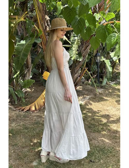 Long dress with ruffles made of cotton with embroidered guipure detail below the chest. V-neckline and thin straps adjustable in height. Anti-transparency inner lining.