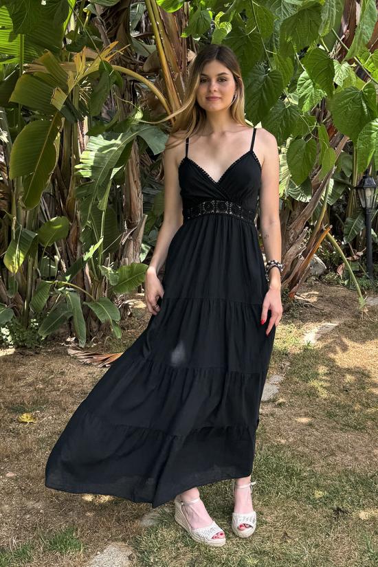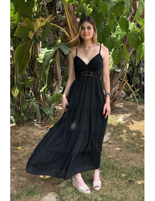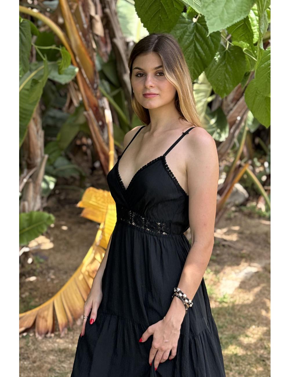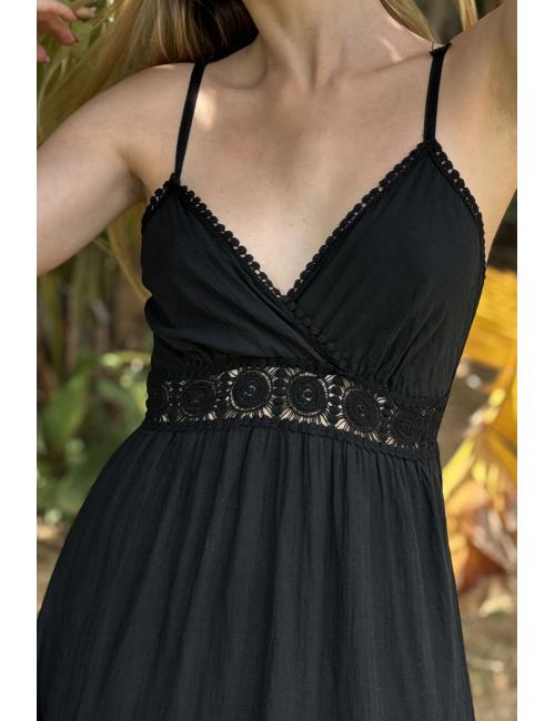 Long dress with ruffles made of cotton with embroidered guipure detail below the chest. V-neckline and thin straps adjustable in height. Anti-transparency inner lining.