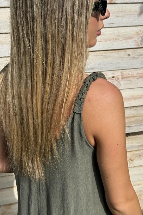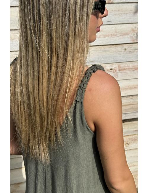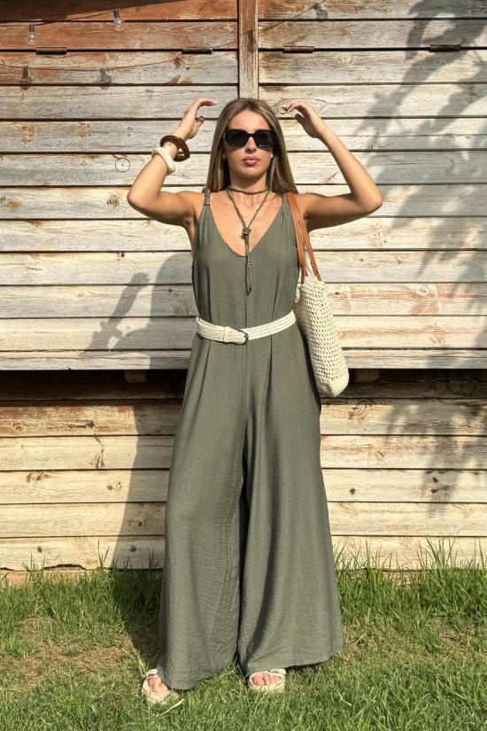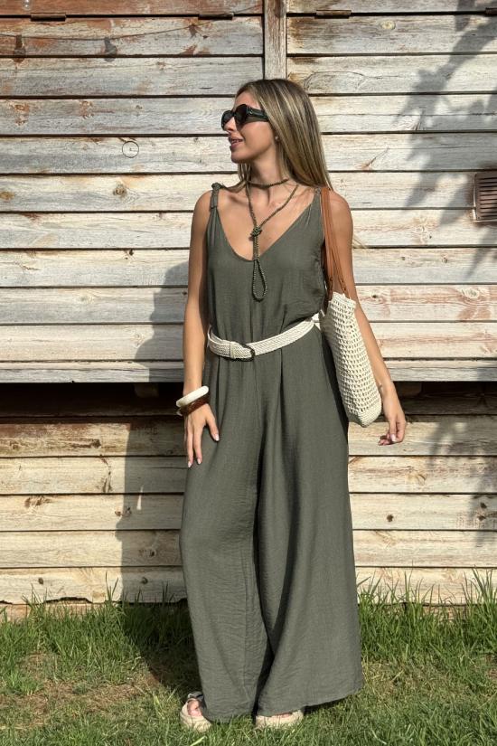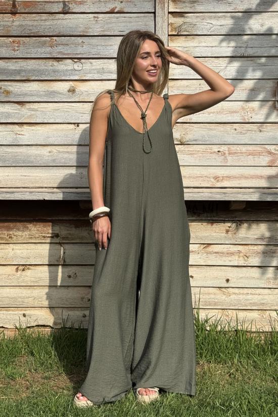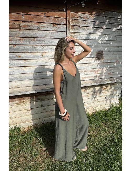 Long flowing jumpsuit with straps, made in crepe fabric. Thin straps, wide back neckline and V-neckline in front.