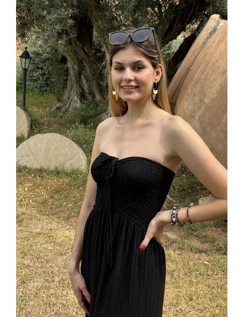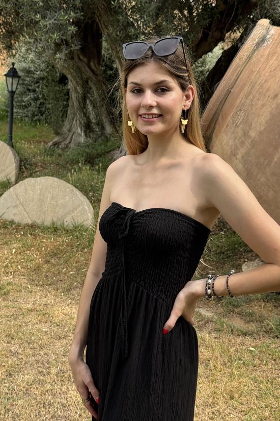 Oversize long flowing jumpsuit made in bambula fabric. Strapless neckline and elasticated honeycomb elasticated chest with two straps that can be tied as a bow or tied at the neck.