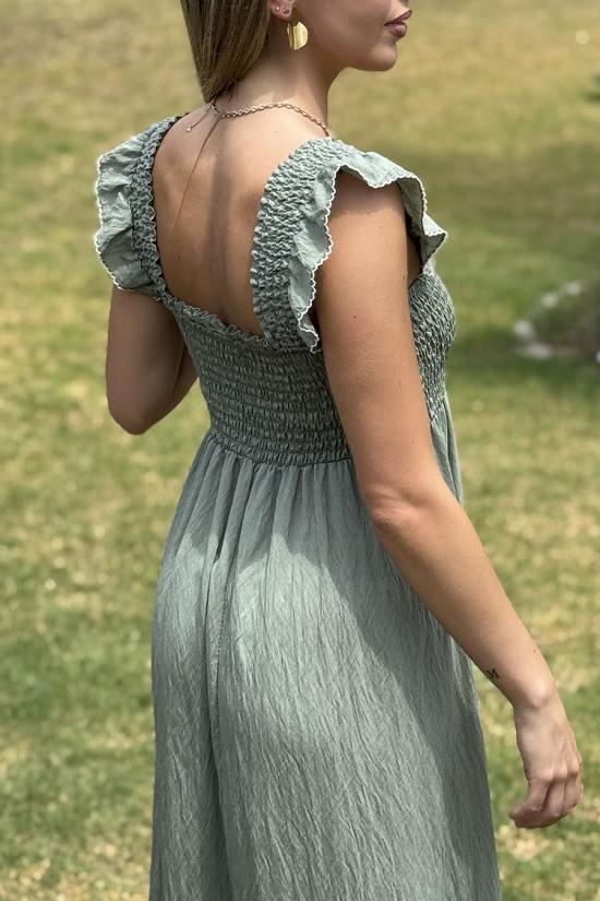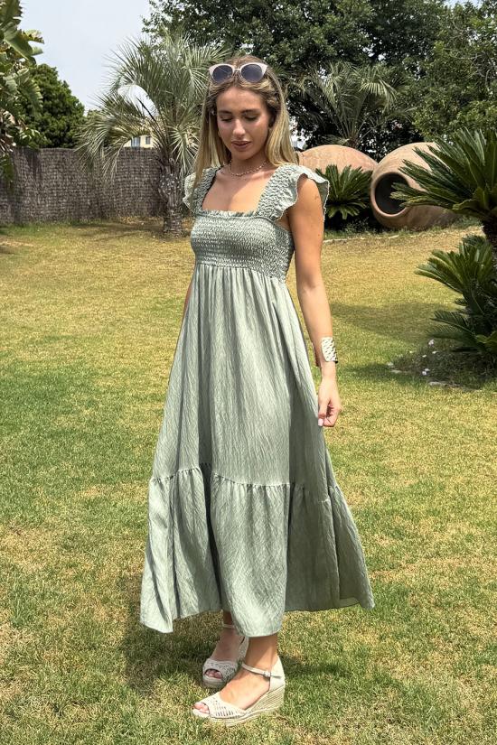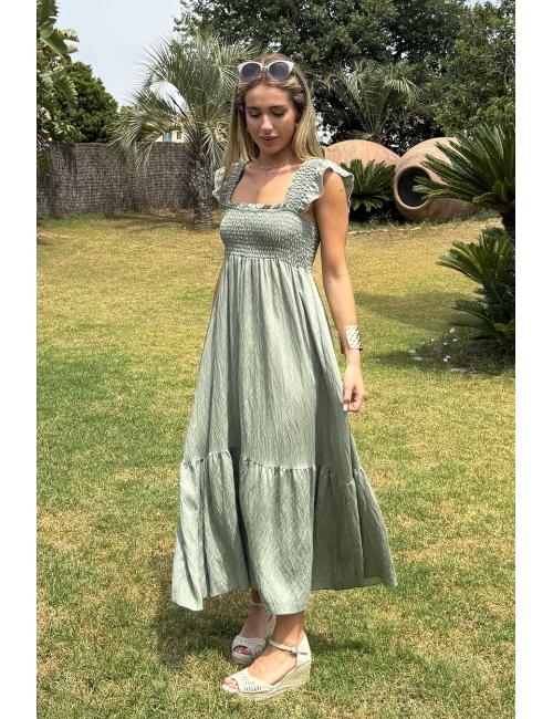 Long dress with sleeveless, sleeveless and contrast trimmed shoulders. Chest made with elastic honeycomb that makes it adaptable to various sizes.  Straight front and back neckline.