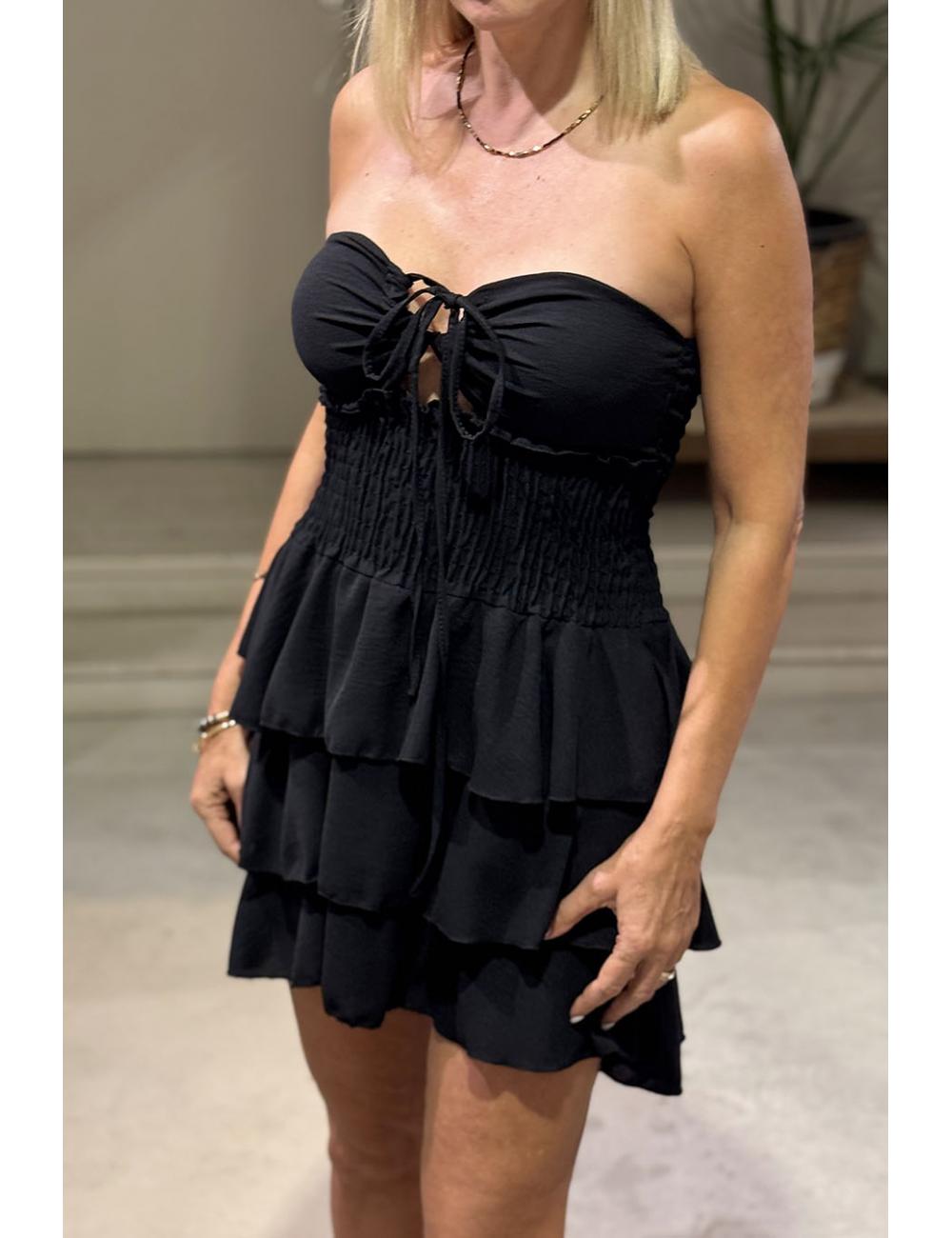 Strapless mini dress with bare shoulders and back. Stretch honeycomb fabric at the waist. Ties at the chest or neck. Cut-out style opening and ruffled skirt.
