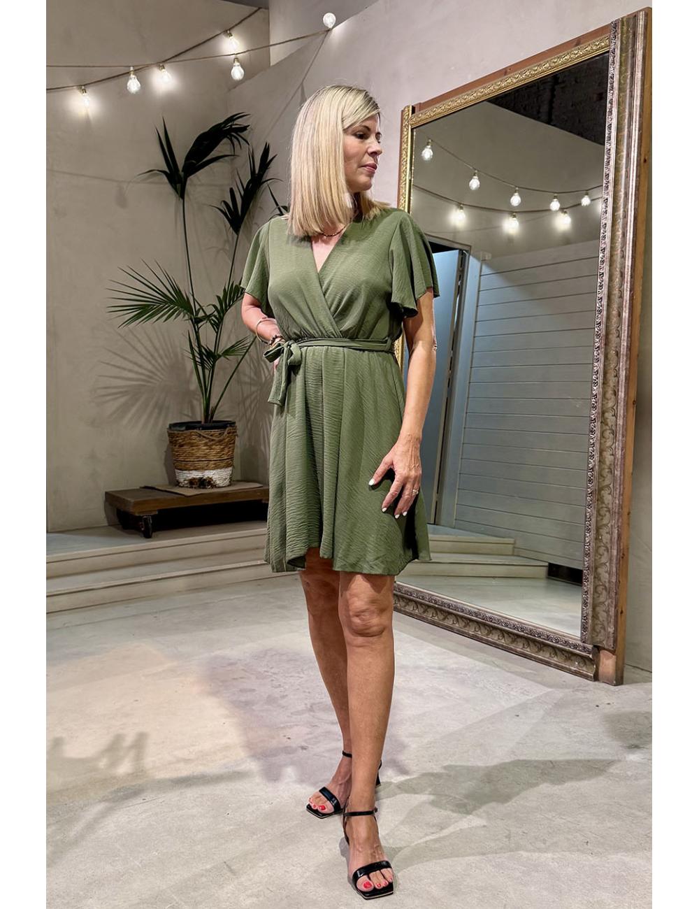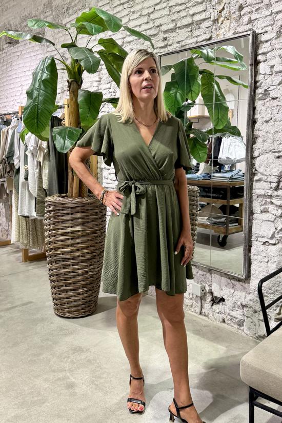 Short wrap dress with short sleeves and a V-neck. Fine crepe fabric. Belt loops and tie at the waist for a better fit.